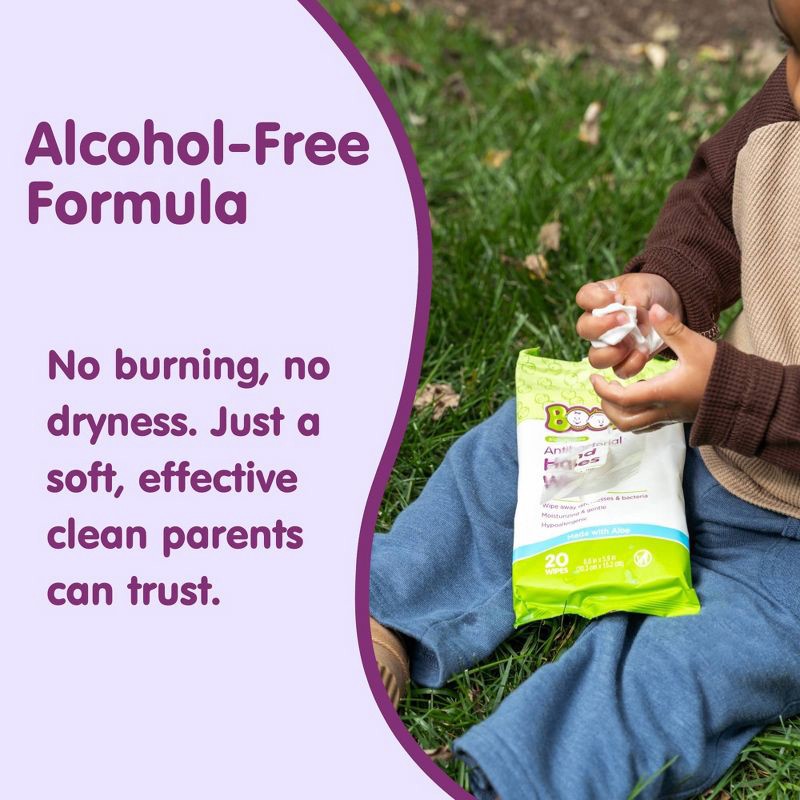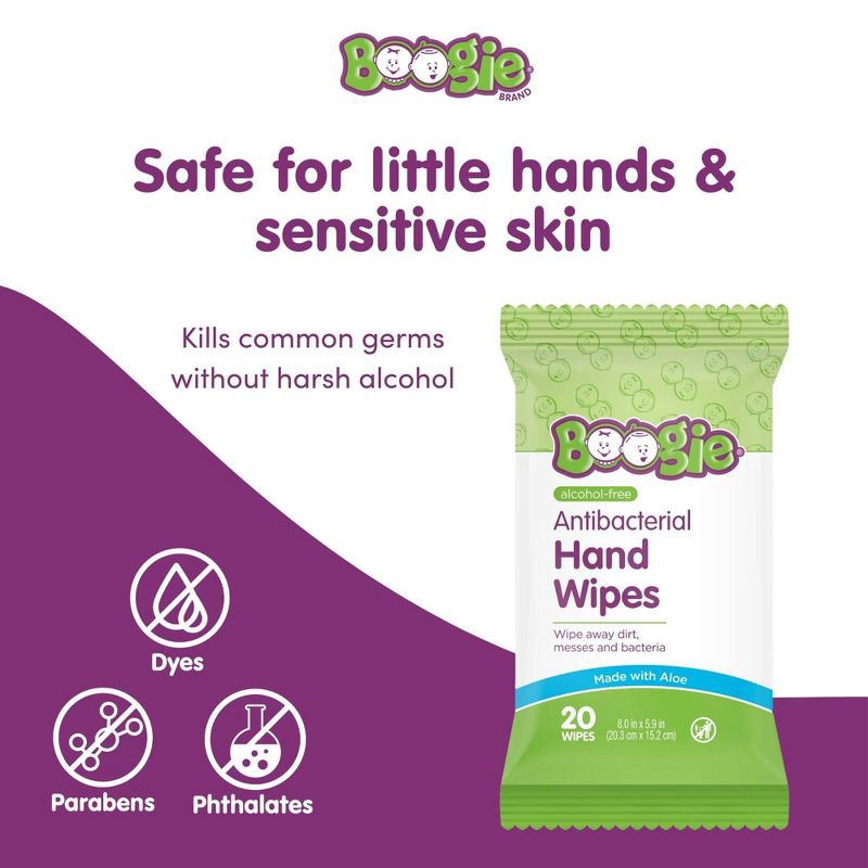 - ANTIBACTERIAL HAND WIPES: Boogie Antibacterial Hand Wipes wipe away dirt, messes and bacteria from the hands and body when soap and water are not available.