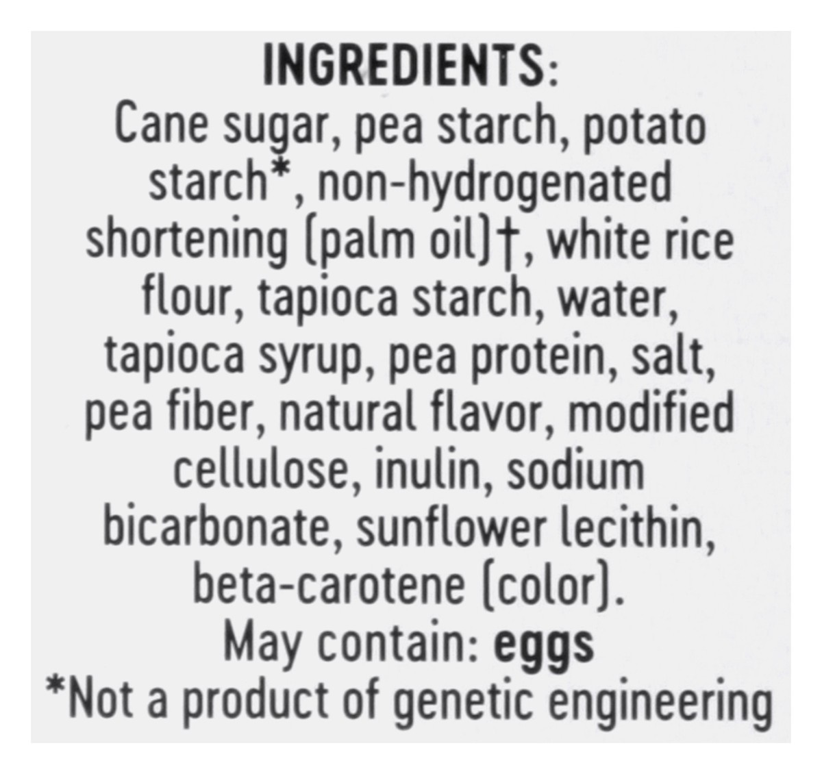 Cane Sugar, Pea Starch, Potato Starch (Not a Product of Genetic Engineering), Non-Hydrogenated Shortening (Palm Oil) (RSPO Certified), White Rice Flour, Tapioca Starch, Water, Tapioca Syrup, Pea Prote…