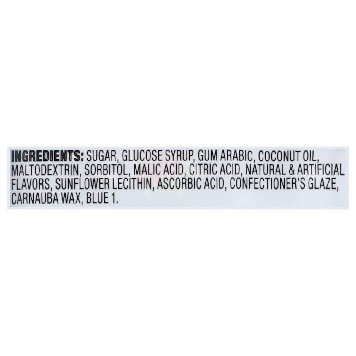 Sugar, Glucose Syrup, Gum Arabic, Coconut Oil, Maltodextrin, Sorbitol, Malic Acid, Citric Acid, Natural & Artificial Flavors, Sunflower Lecithin, Ascorbic Acid, Confectioner's Glaze, Carnauba Wax, Blu…