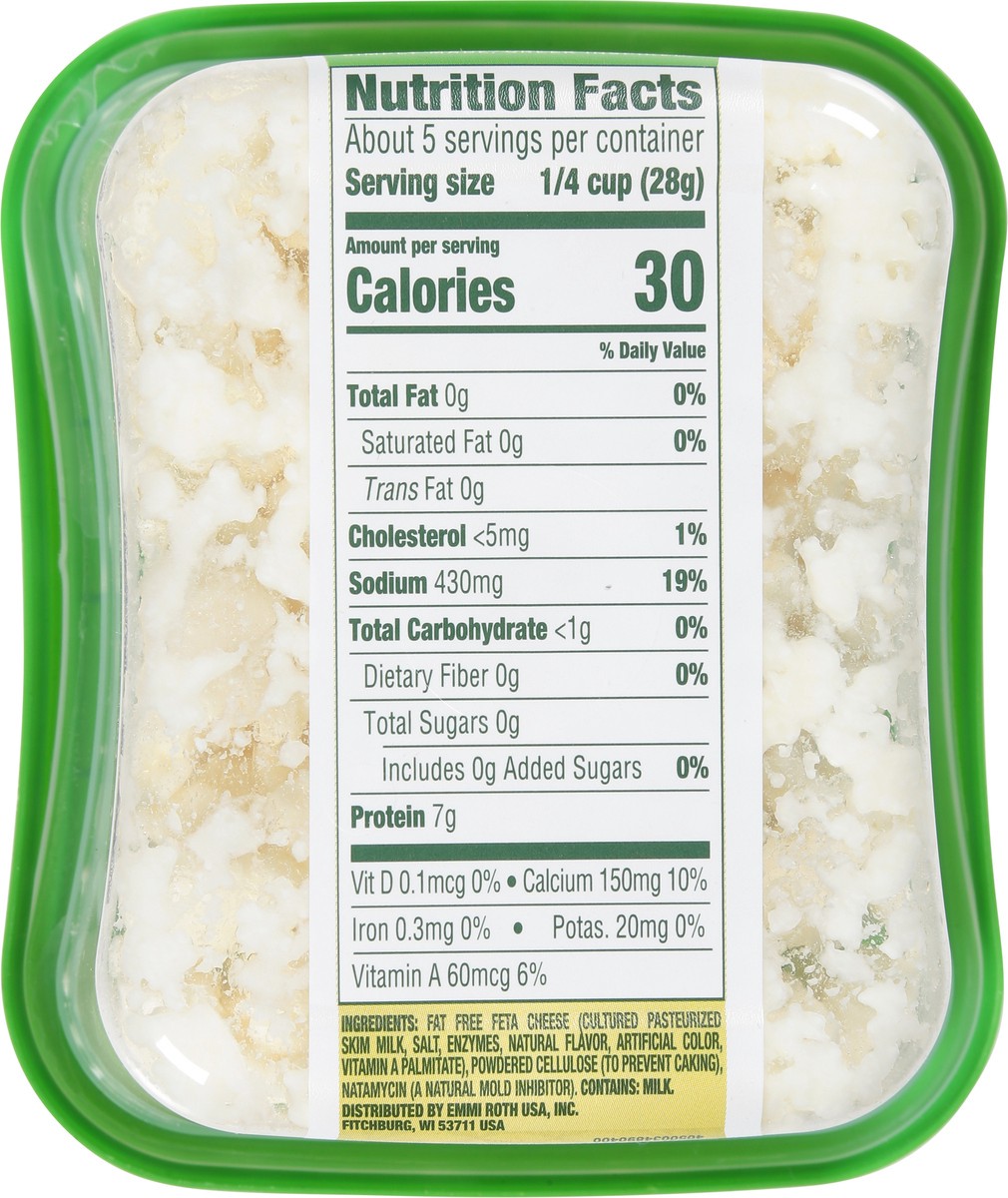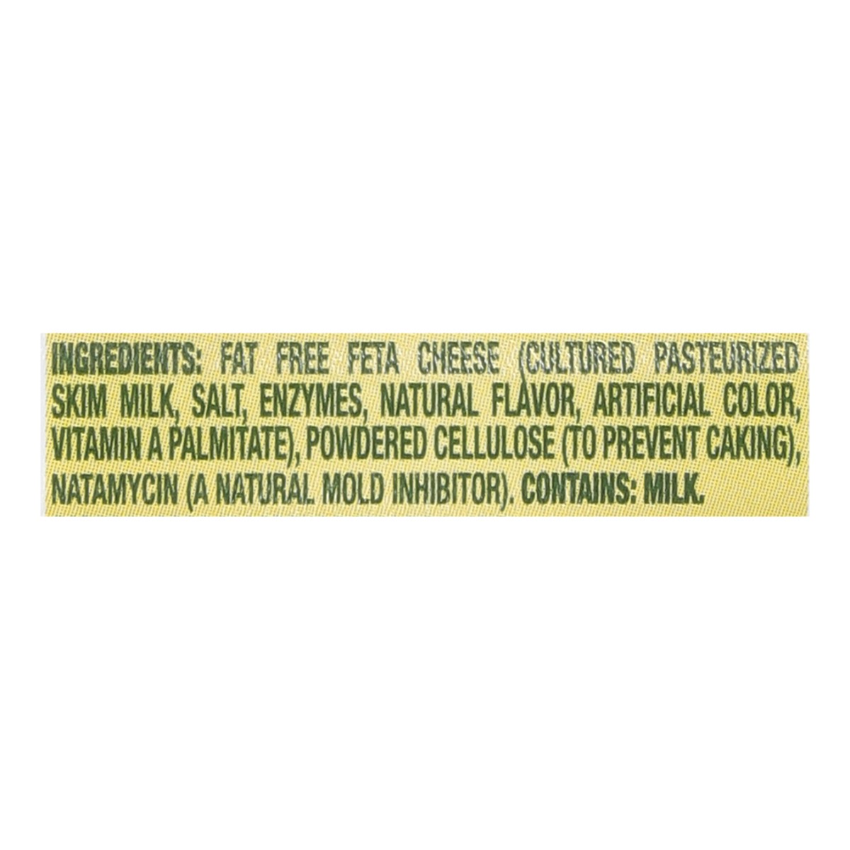 Fat Free Feta Cheese (Cultured Pasteurized Skim Milk, Salt, Enzymes, Natural Flavor, Artificial Color, Vitamin A Palmitate), Powdered Cellulose (to Prevent Caking), Natamycin (a Natural Mold Inhibitor…