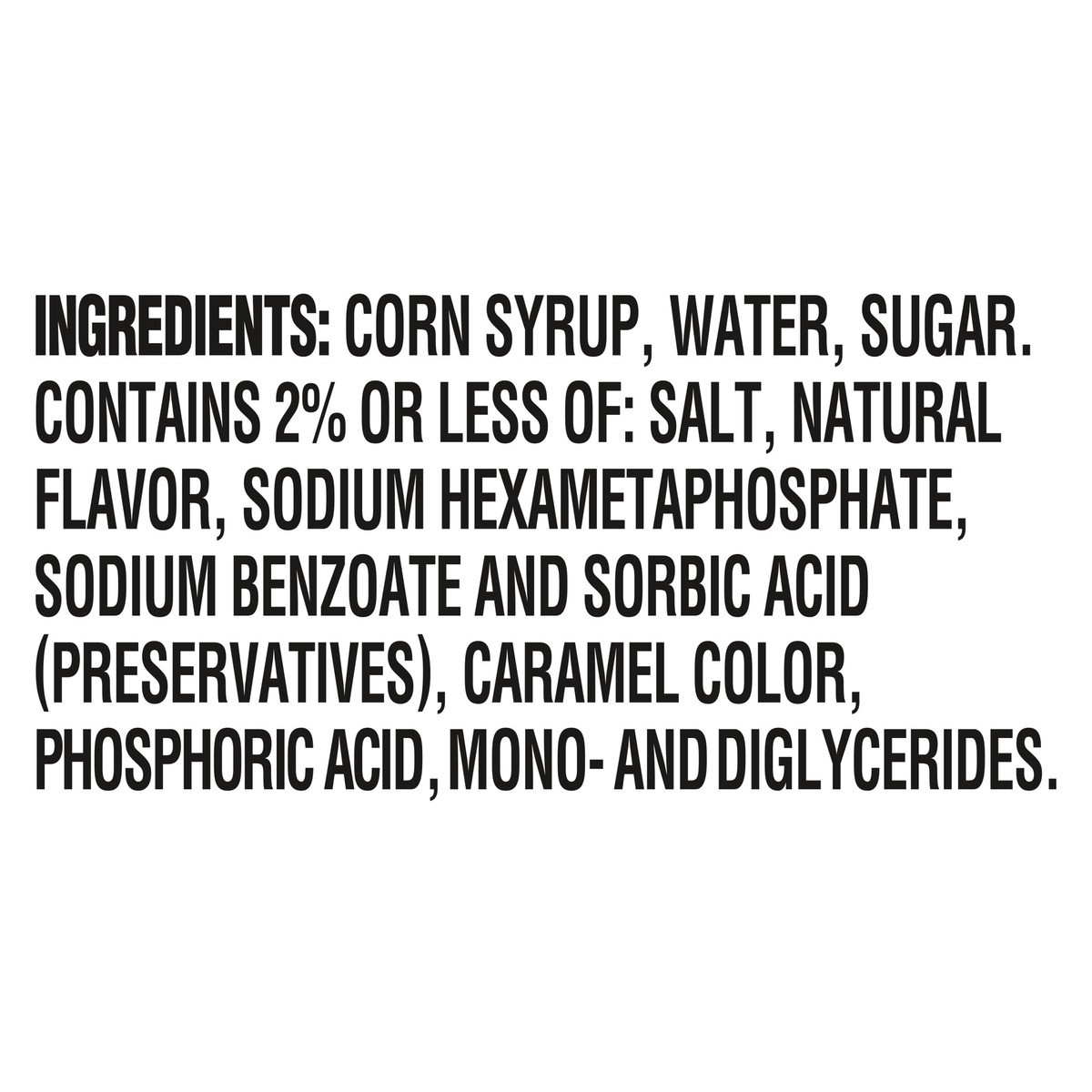 INGREDIENTS: CORN SYRUP, WATER, SUGAR. CONTAINS 2% OR LESS OF: SALT, NATURAL FLAVOR, SODIUM HEXAMETAPHOSPHATE, SODIUM BENZOATE AND SORBIC ACID (PRESERVATIVES), CARAMEL COLOR, PHOSPHORIC ACID, MONO AND…