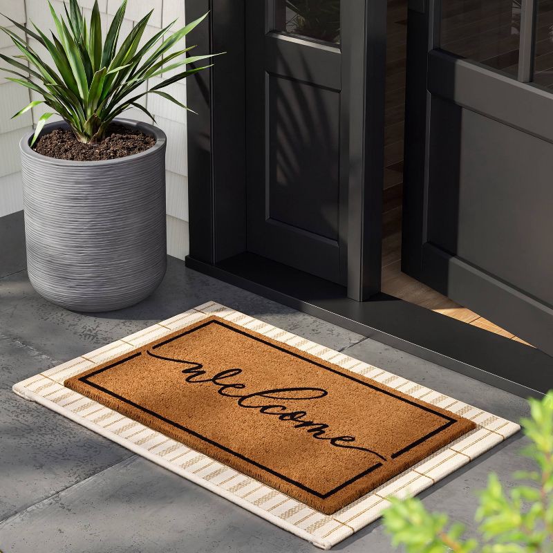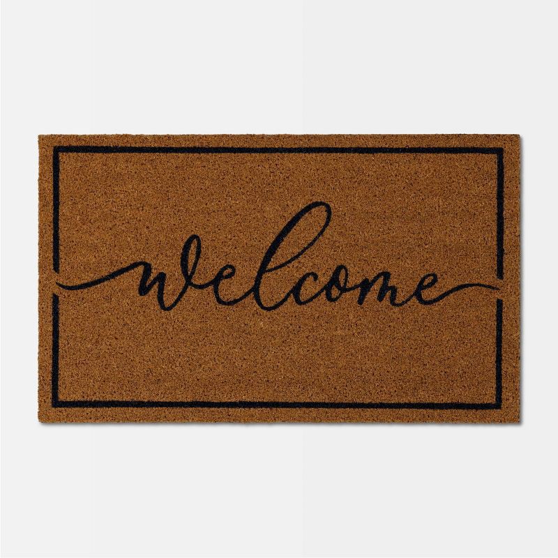 Give your porch or entryway a friendly update with this Cursive 'Welcome' Coir Doormat from Threshold™. The rectangular coir doormat features a blue cursive ''Welcome'' on a natural backdrop for a lov…