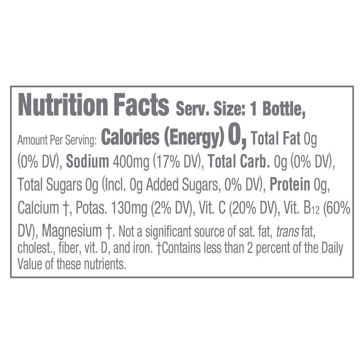 Water, Less Than 0.5% Of: Citric Acid, Electrolytes (Salt, Sodium Citrate, Magnesium And Calcium Chlorides, Mono-Potassium Phosphate), Vitamins B12 And C (Cyanocobalamin And Ascorbic Acid), Natural Fl…