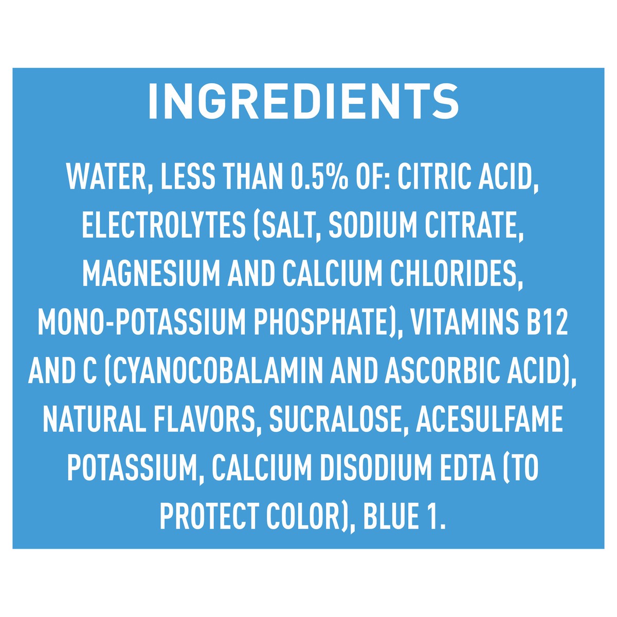 Water, Less than 0.5% of: Citric Acid, Electrolytes (Salt, Sodium Citrate, Magnesium and Calcium Chlorides, Mono-Potassium Phosphate), Vitamins B12 and C (Cyanocobalamin and Ascorbic Acid), Natural Fl…