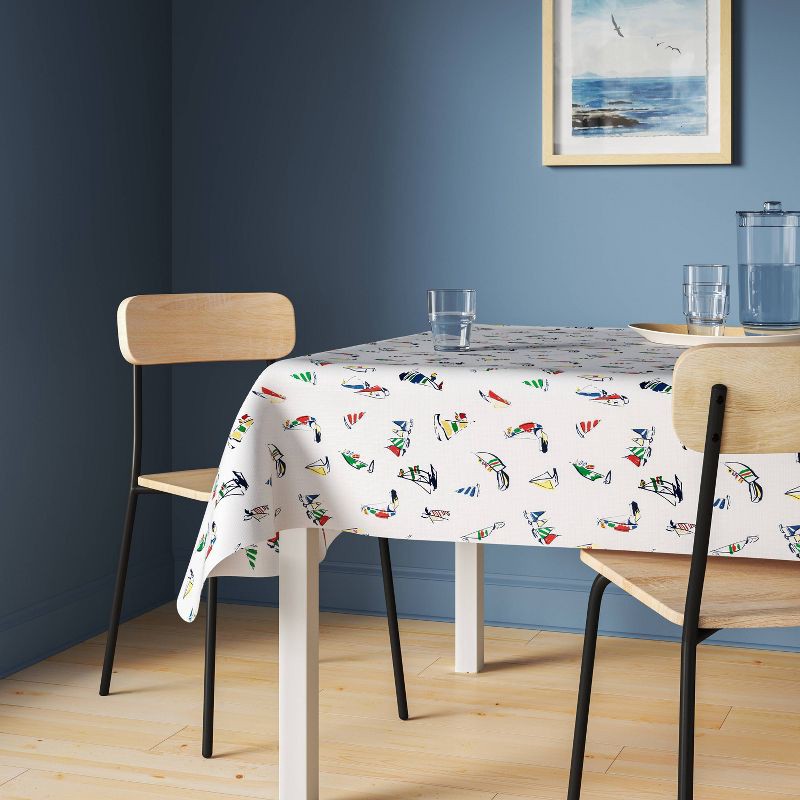 Bring nautical vibes to your dining space with this Sailboat Print Tablecloth from Room Essentials™. This oblong-shaped tablecloth is adorned with allover paintbrush-style sailboats on a white backgro…