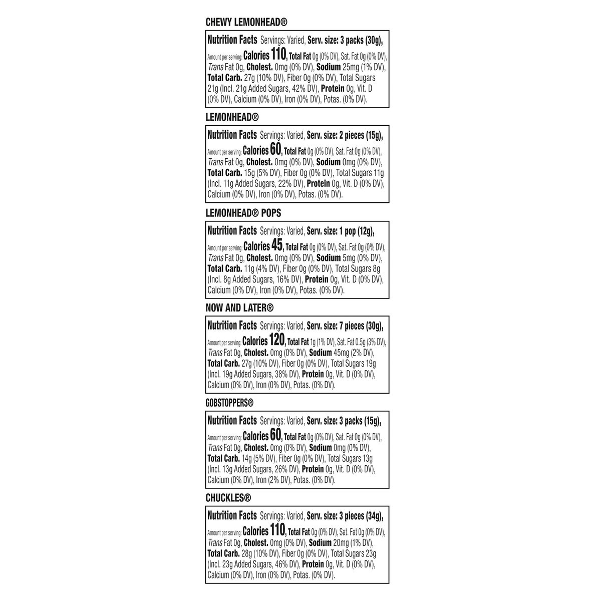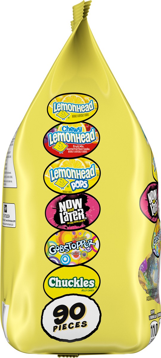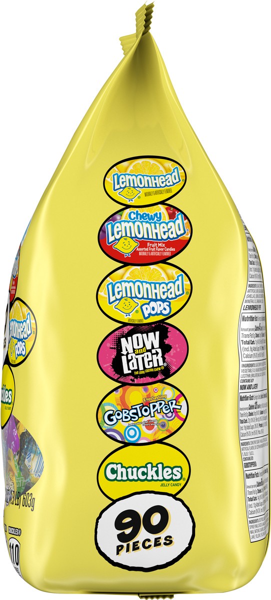 LEMONHEAD. CHEWY LEMONHEAD FRUIT MIX ASSORTED FRUIT FLAVOR CANDIES. NOW AND LATER THE LONG LASTING CHEW. LEMONHEAD POPS. GOBSTOPPERS: EVERLASTING JAWBREAKERS CHANGE COLORS AND FLAVORS! CHUCKLES JELL C…
