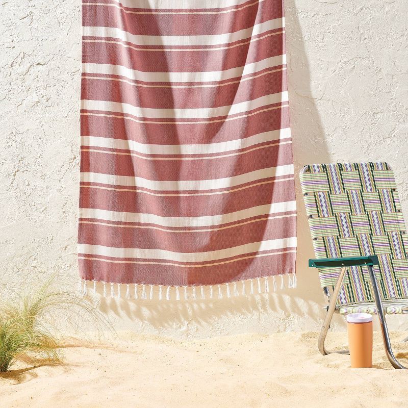 Elevate your beach style with this Jacquard Turkish Lightweight Striped Oversized Beach Towel with Knotted Fringe from Room Essentials™. This jacquard Turkish oversized towel features a classic stripe…