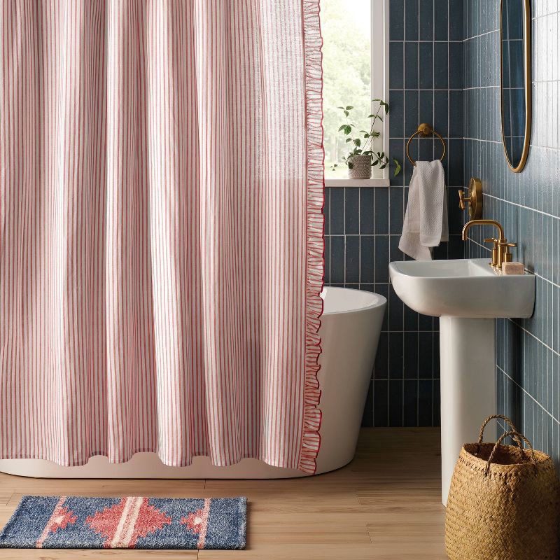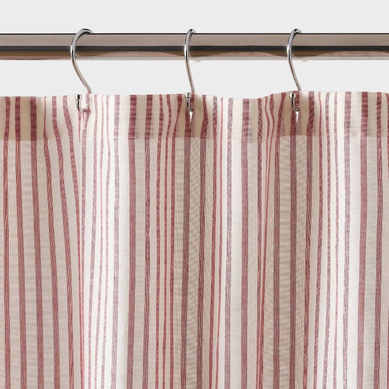 Give your wash space the perfect Fourth of July makeover with this Americana Striped Ruffle Shower Curtain from Threshold™. Designed with allover red vertical stripes on a white background, this decor…