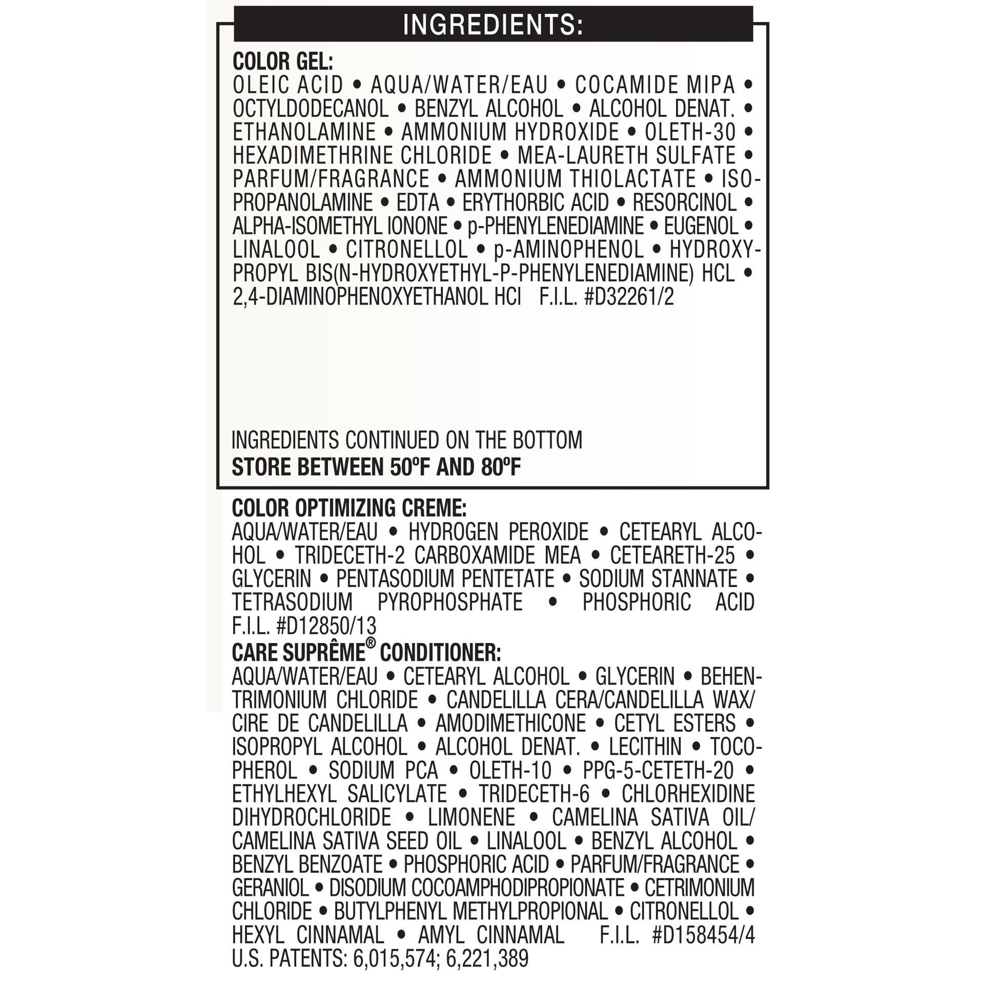Color Gel: Oleic Acid, Aqua/Water, Cocamide MIPA, Octyldodecanol, Benzyl Alcohol, Alcohol Denat., Ethanolamine, Ammonium Hydroxide, Oleth-30, Hexadimethrine Chloride, MEA-Laureth Sulfate, Fragrance, A…