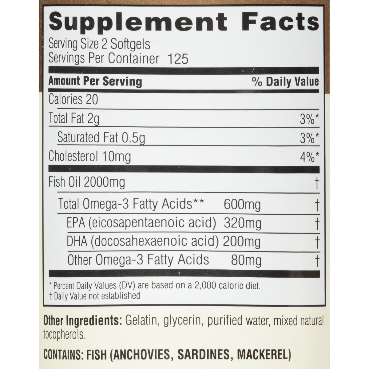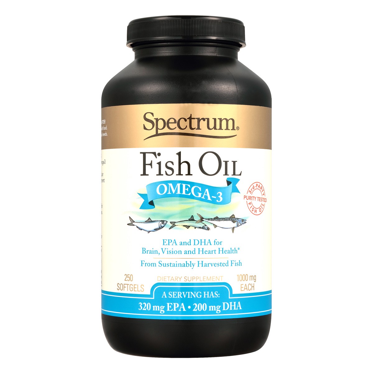 Dietary Supplement. EPA and DHA for brain, vision and heart health. From sustainably harvested fish. A serving has: 320 mg EPA. 200 mg DHA. Purity Tested: 3rd party fish oil. The benefits of omega-3 f…