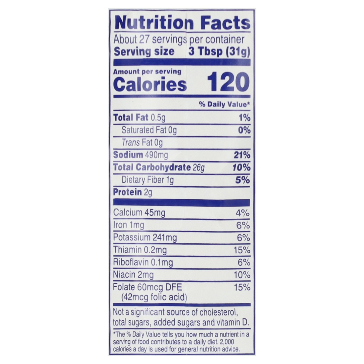 Per 3 Tbsp: 120 calories; 0 g sat fat (0% DV); 490 mg sodium (21% DV); 0 g sugars. Enriched. Making family traditions easy for over 100 years. Making Family Traditions Easy: If you grew up in the Sout…