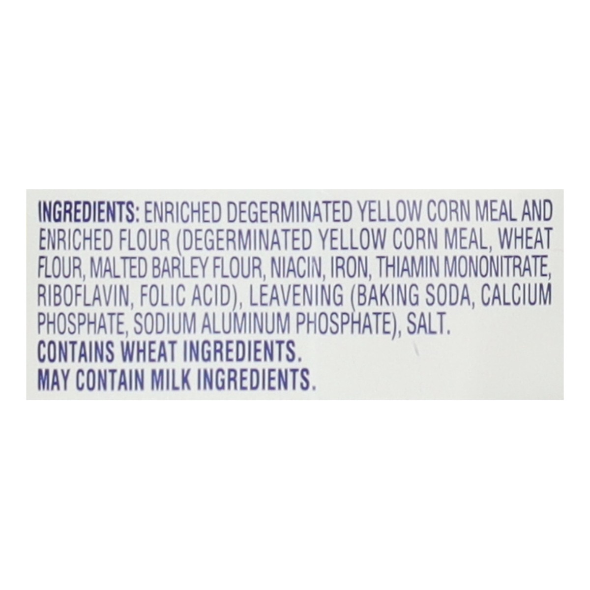 Enriched Degerminated Yellow Corn Meal and Enriched Flour (Degerminated Yellow Corn Meal, Wheat Flour, Malted Barley Flour, Niacin, Iron, Thiamin Mononitrate, Riboflavin, Folic Acid), Leavening (Bakin…