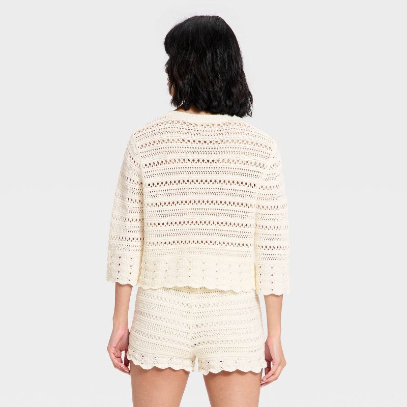 Women's Quarter Sleeve Openwork Crewneck Pullover Sweater - Universal Thread™ Cream XS