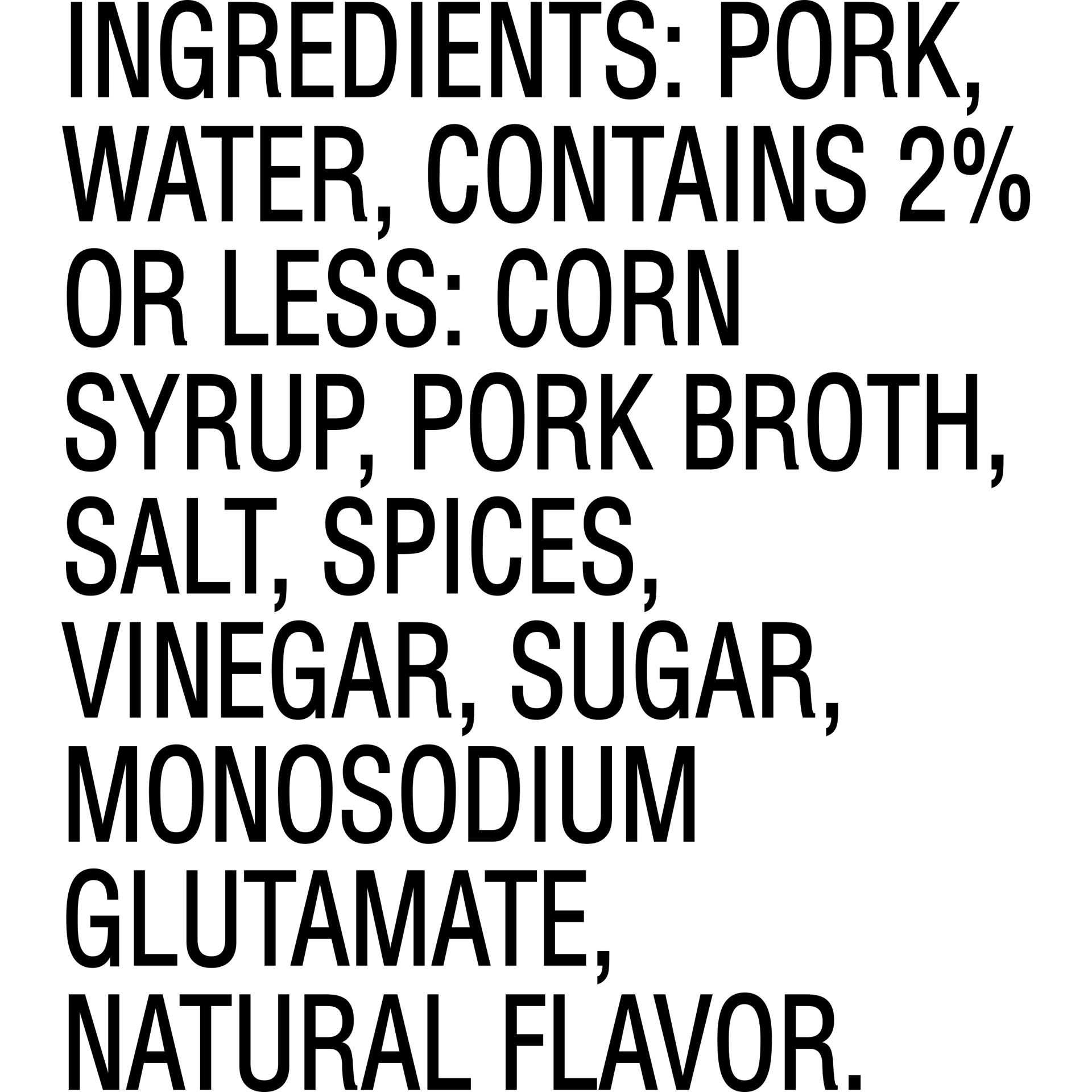 Pork, Water, Contains 2% Or Less: Corn Syrup, Salt, Natural Flavor, Vinegar, Sugar, Monosodium Glutamate, Pork Broth.