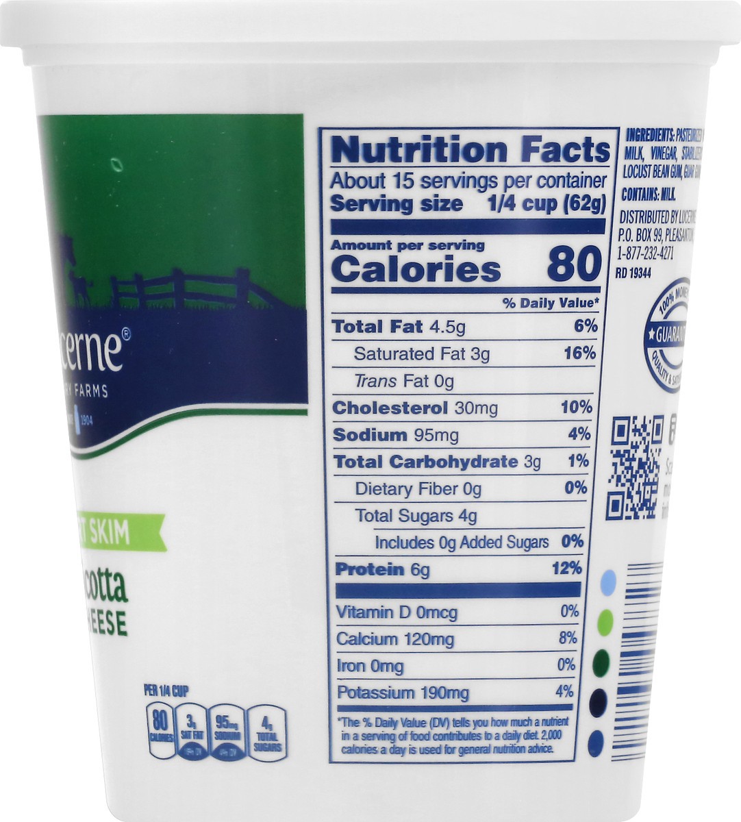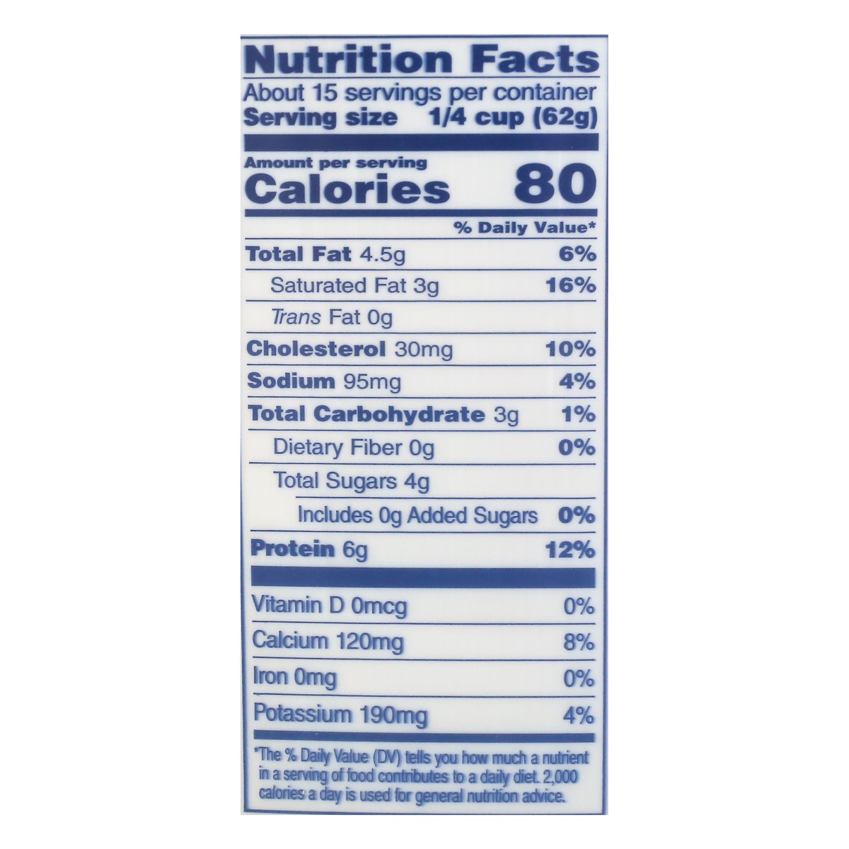 Per 1/4 Cup: 80 calories; 3 g sat fat (16% DV); 95 mg sodium (4% DV); 4 g total sugars. Dairy farms. Since 1904. Made with milk from cows not treated with rbST (The FDA states that no significant diff…