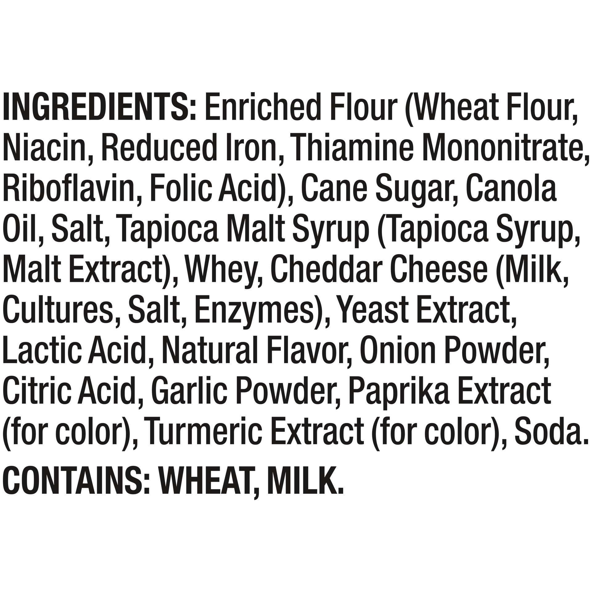 INGREDIENTS: ENRICHED FLOUR (WHEAT FLOUR, NIACIN, REDUCED IRON, THIAMINE MONONITRATE, RIBOFLAVIN, FOLIC ACID), CANE SUGAR, CANOLA OIL, SALT, TAPIOCA MALT SYRUP (TAPIOCA SYRUP, MALT EXTRACT), WHEY, CHE…