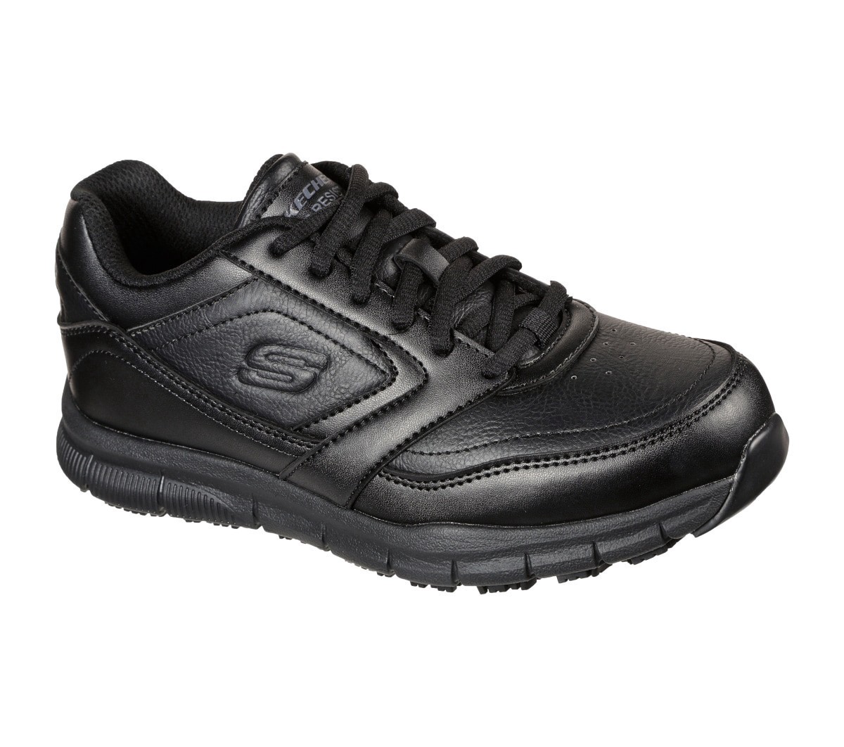 Surefooted comfort and safety combine in Skechers Work Relaxed Fit Nampa Wyola SR. This slipresistant design features a smooth synthetic leather upper with a laceup front and a cushioned Skechers Mem…