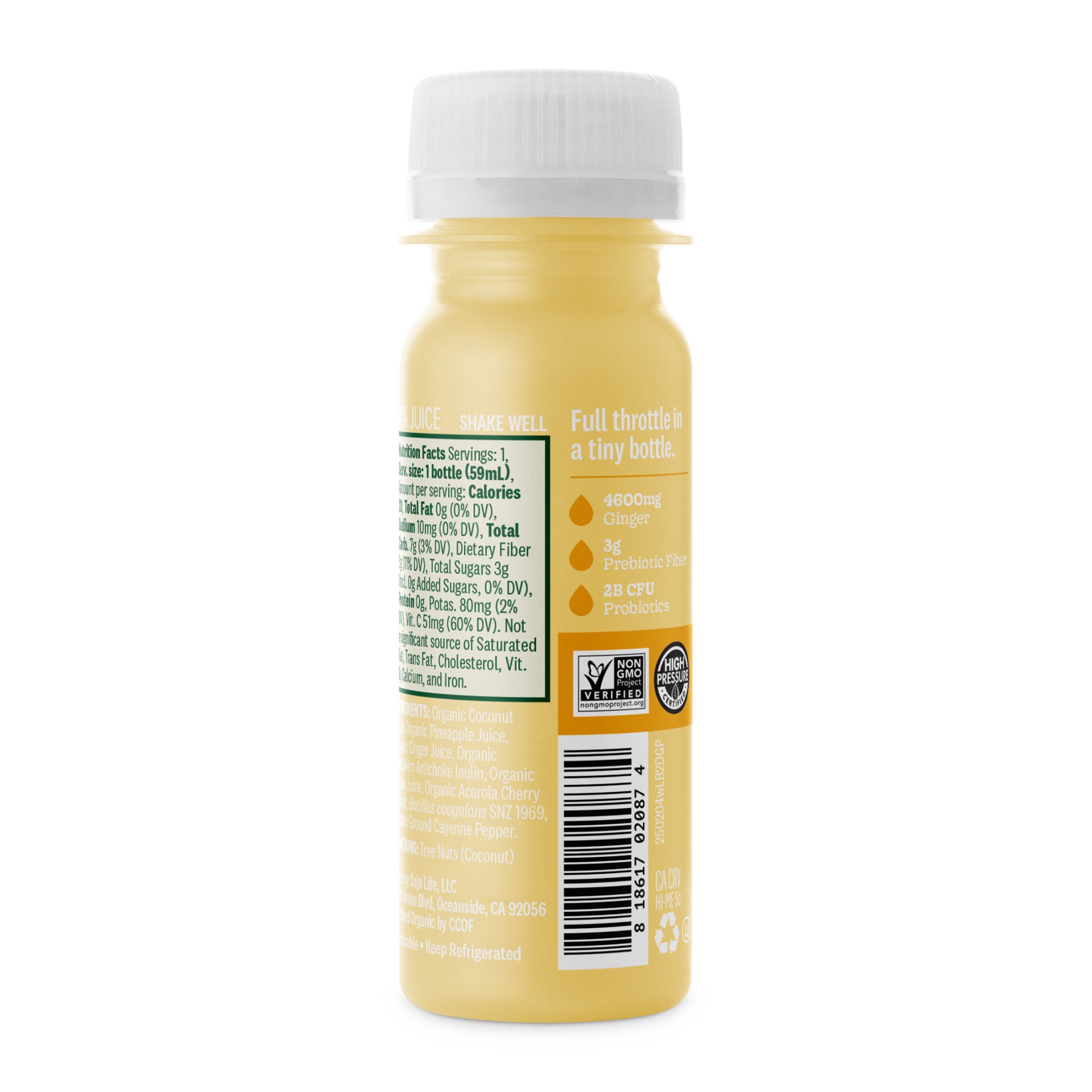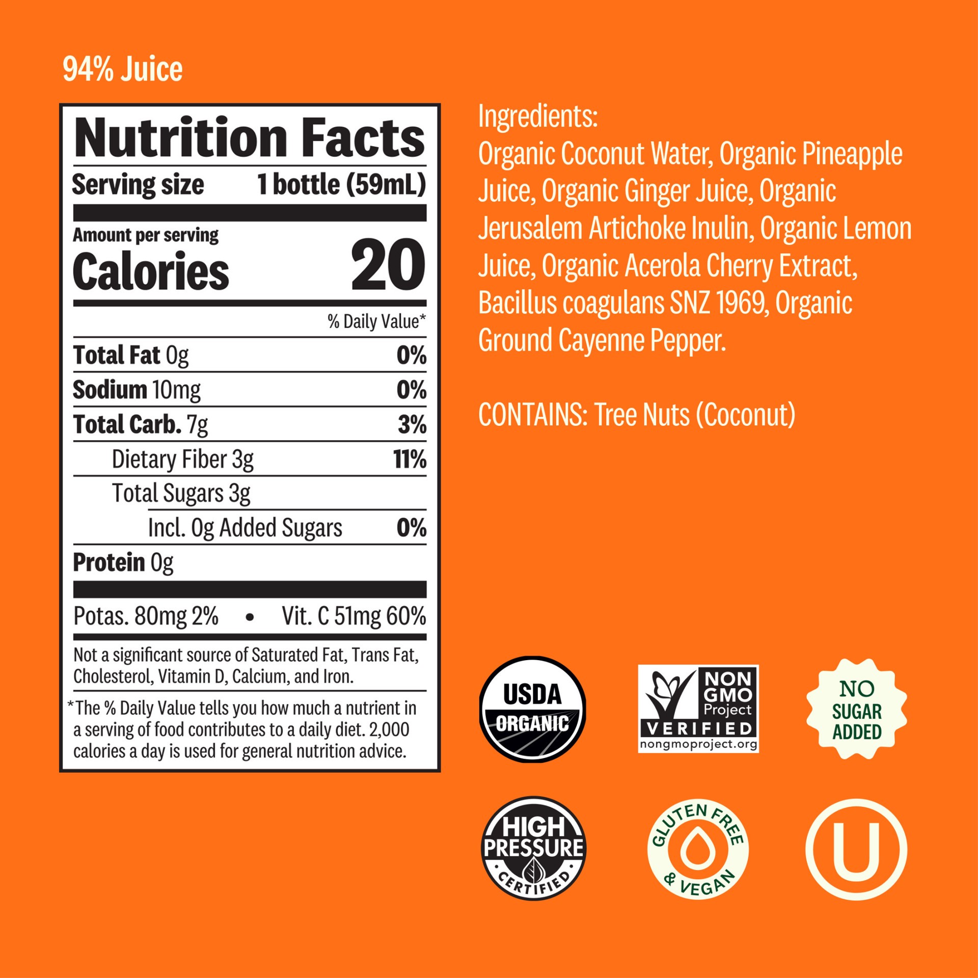 Organic Coconut Water, Organic Pineapple Juice, Organic Ginger Juice, Organic Jerusalem Artichoke Inulin, Organic Lemon Juice, Organic Acerola Cherry Extract, Bacillus coagulans SNZ 1969, Organic Grou…