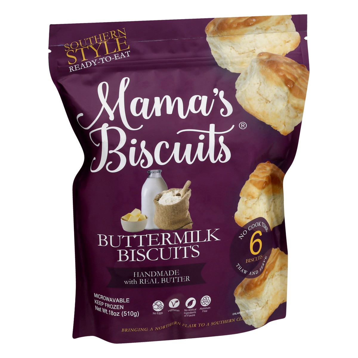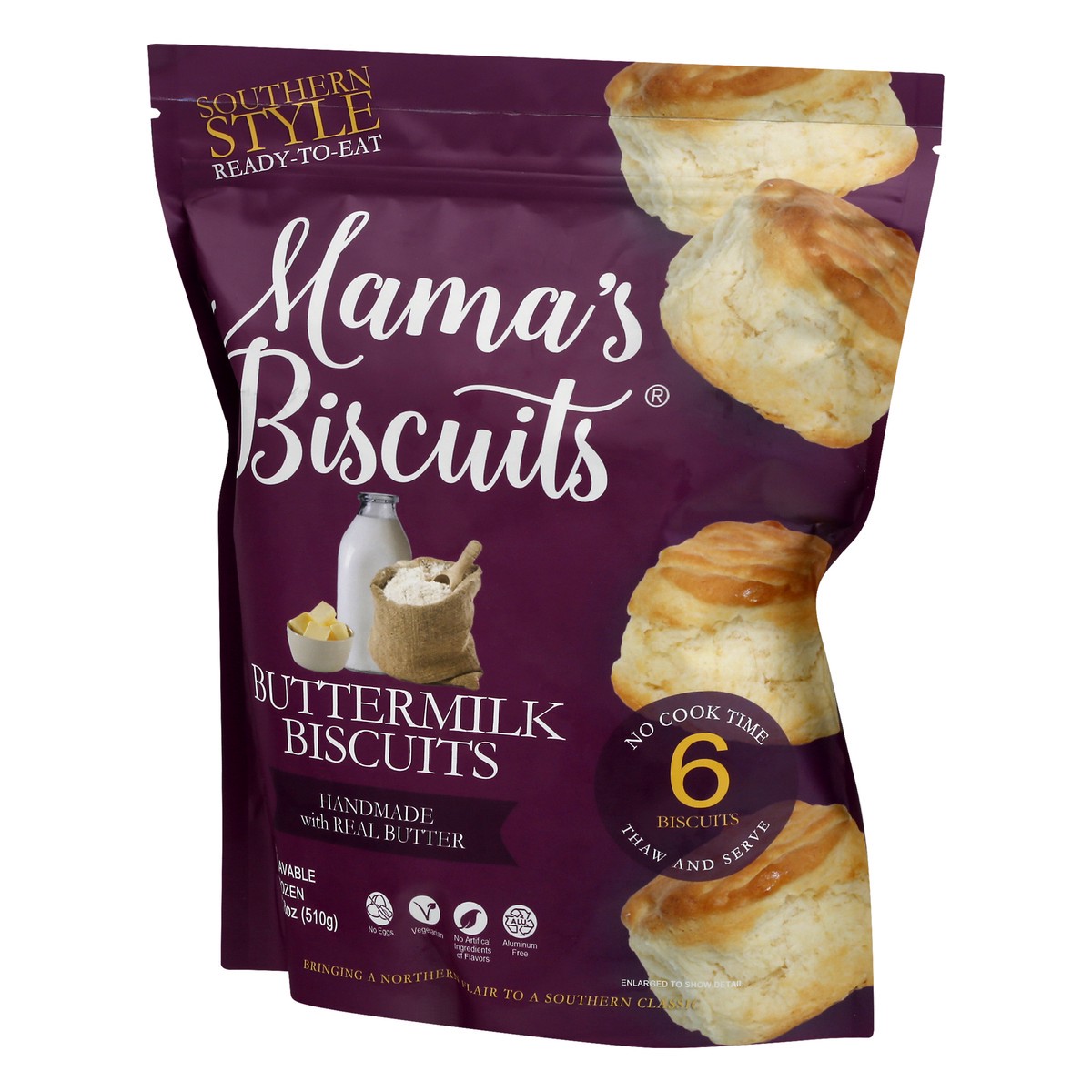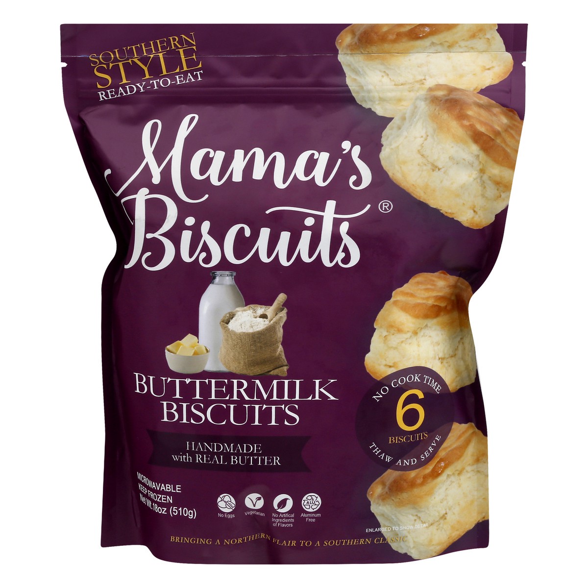 Handmade with real butter. No artificial ingredients of flavors. Vegetarian. Southern style ready to eat. No eggs. Aluminum free. Bringing a Northern Flair to a Southern classic. No cook time 6 biscui…