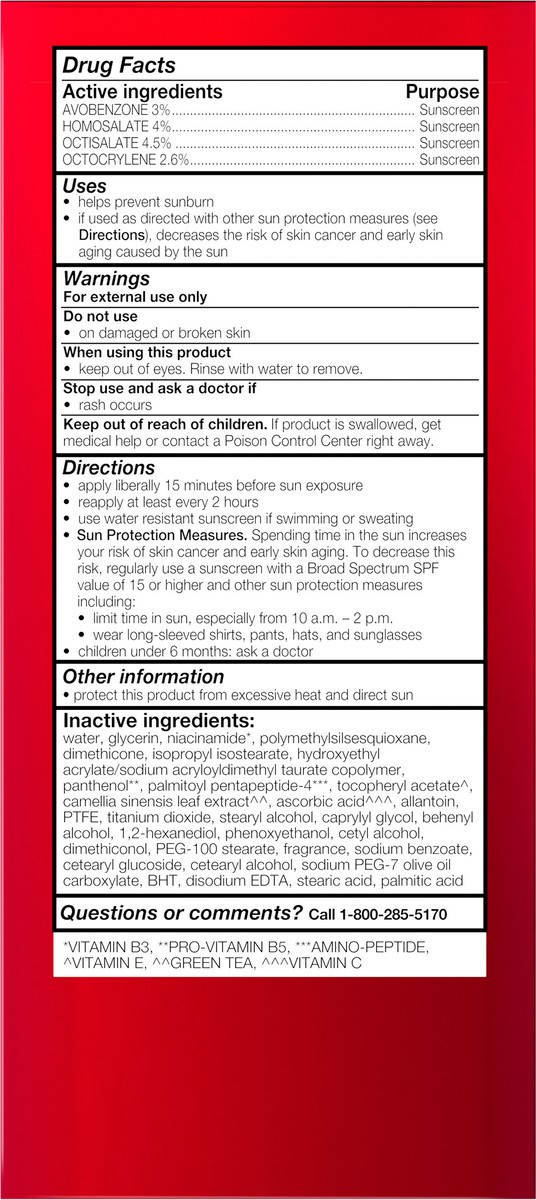 Active Ingredients: Avobenzone (3 %), Sunscreen; Homosalate (4 %), Sunscreen; Octisalate (4.5 %), Sunscreen; Octocrylene (2.6 %), Sunscreen. Inactive Ingredients: Water, Glycerin, Niacinamide (Vitamin…