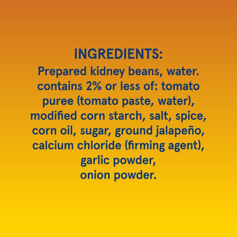 Prepared Kidney Beans, Water, Contains 2% or Less of: Tomato Puree (Tomato Paste, Water), Modified Corn Starch, Salt, Spice, Sugar, Corn Oil, Ground Jalapeño Pepper, Calcium Chloride (Firming Agent), …