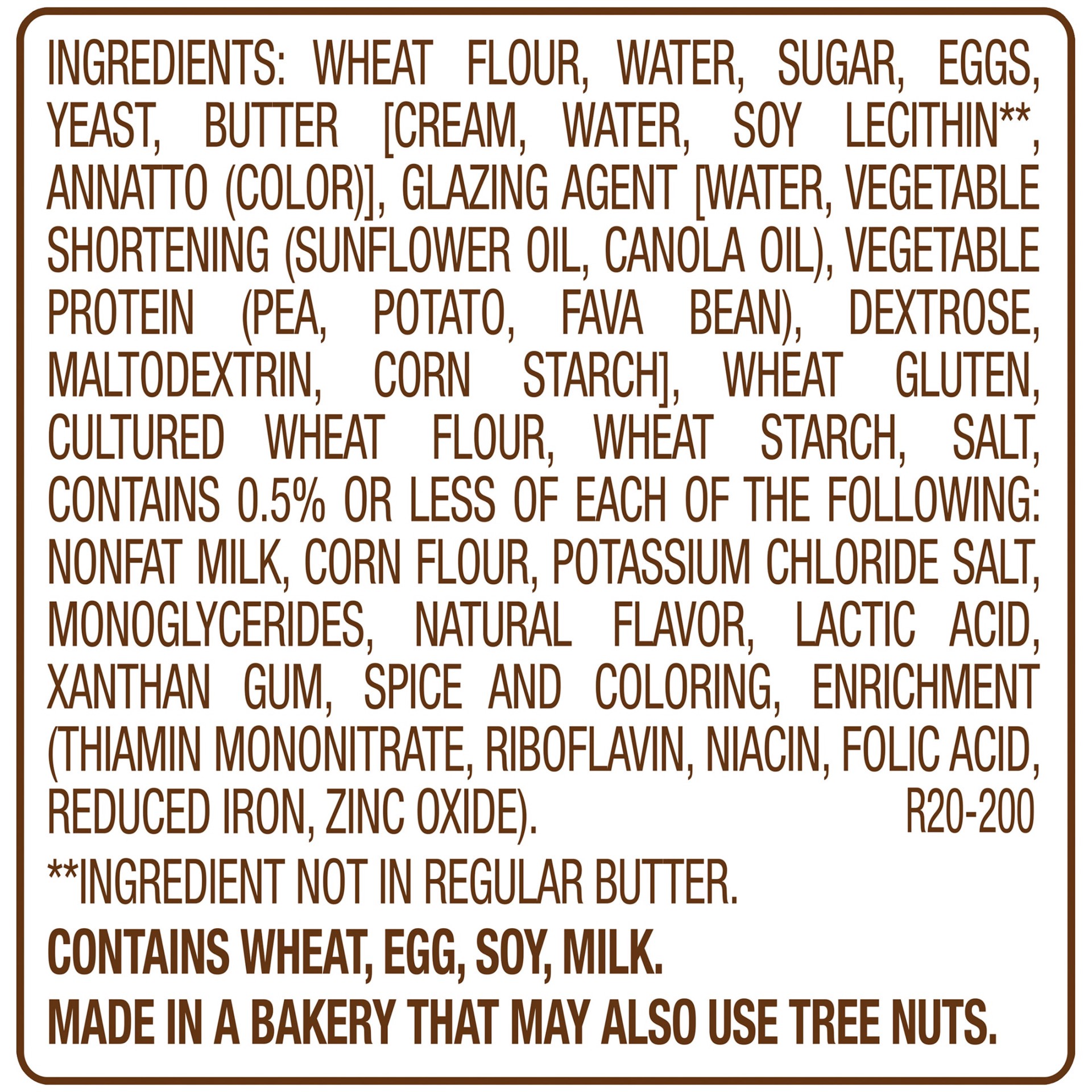 Wheat Flour, Water, Sugar, Eggs, Yeast, Butter [Milk Fat And Non-Fat Milk Solids, Water, Soy Lecithin**, Salt, Annatto Extract], Bun Glaze [Water, Vegetable Shortening [Sunflower Oil And, Canola Oil],…