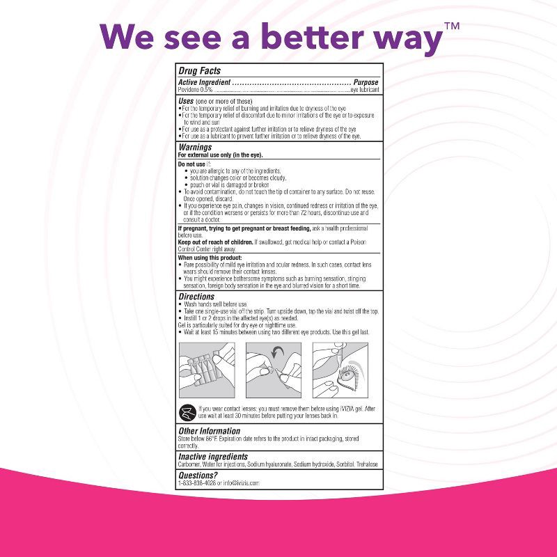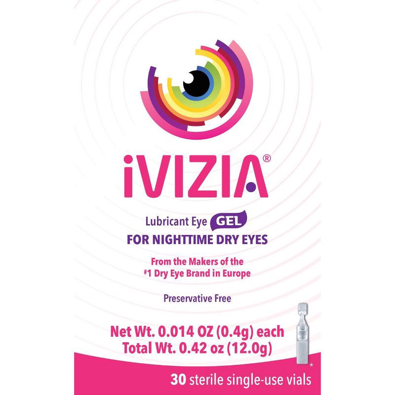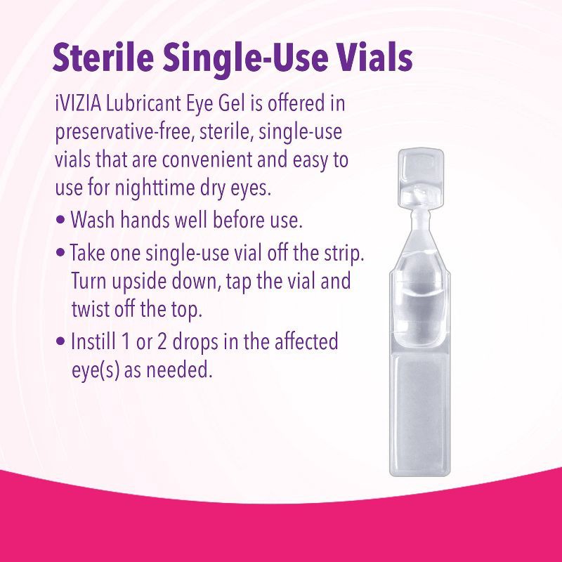 - Sterile Single-Use Vials: iVIZIA Lubricant Eye Gel is offered in preservative-free sterile, single-use vials that are convenient and easy to use for dry eye or nighttime use.