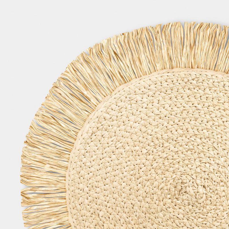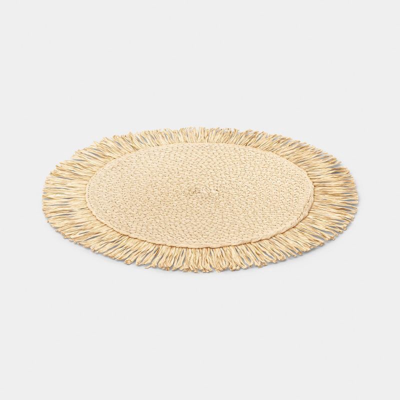 This Woven Fringe Placemat from Threshold™ adds charming, rustic style to your tablescape. Made from natural materials, this round placemat is woven from 100% paper in a natural hue and features fring…
