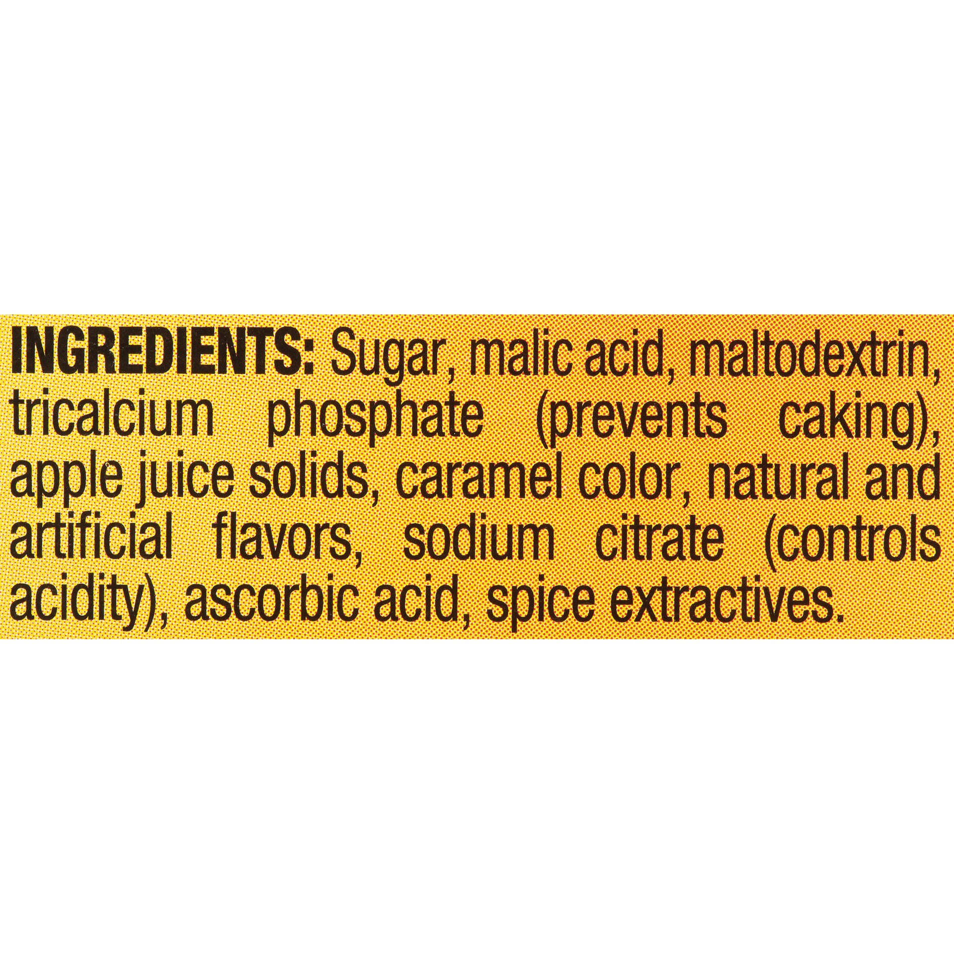 Sugar, Malic Acid, Maltodextrin, Tricalcium Phosphate (Prevents Caking), Apple Juice Solids, Caramel Color, Natural and Artificial Flavors, Sodium Citrate (Controls Acidity), Ascorbic Acid, Spice Extr…