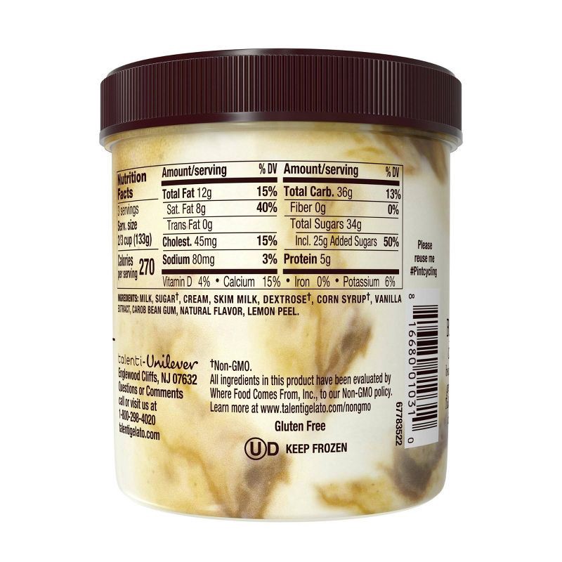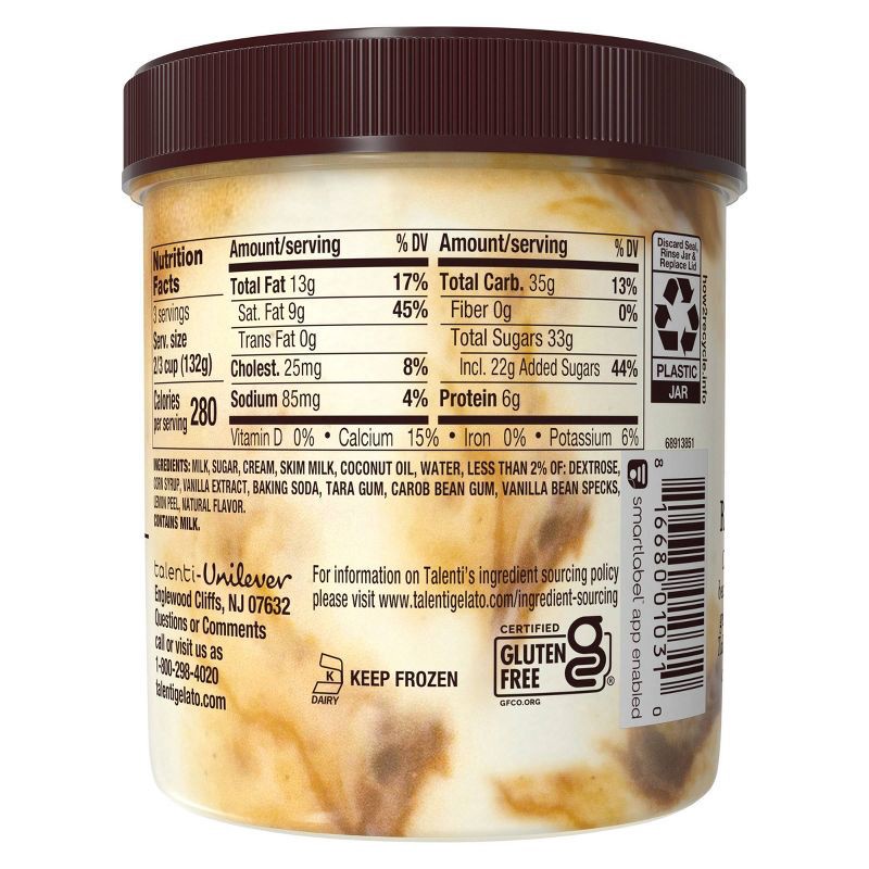 - Classic vanilla bean gelato with a generous swirl of Talenti's decadent dulce de leche