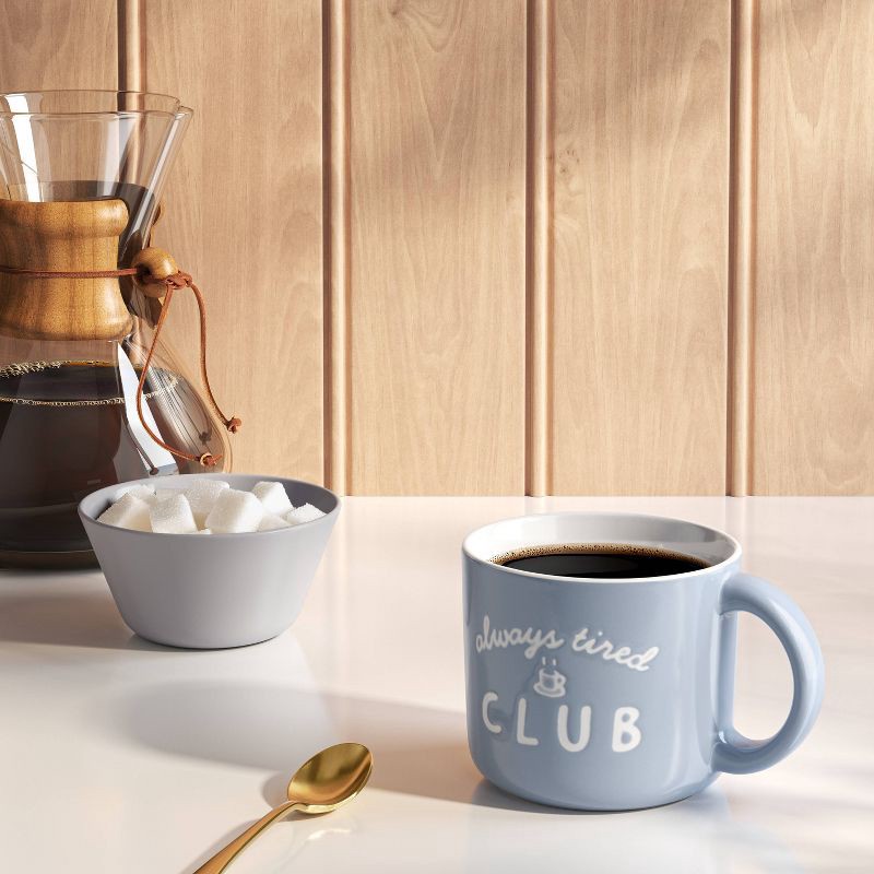 Bring a cool refresh to your drinkware with this 14-Ounce "Always Tired Club" Shortie Mug from Room Essentials™. This shortie mug features the engraved phrase ''Always Tired Club'' with a coffee cup g…