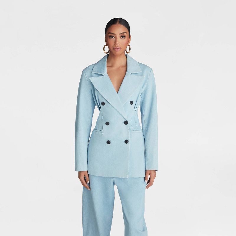 A best-selling silhouette, back in a new hue for the season. This blazer is made from a rigid premium denim fabric and is designed with cinching at the waist for a defined hourglass look. Complete wit…