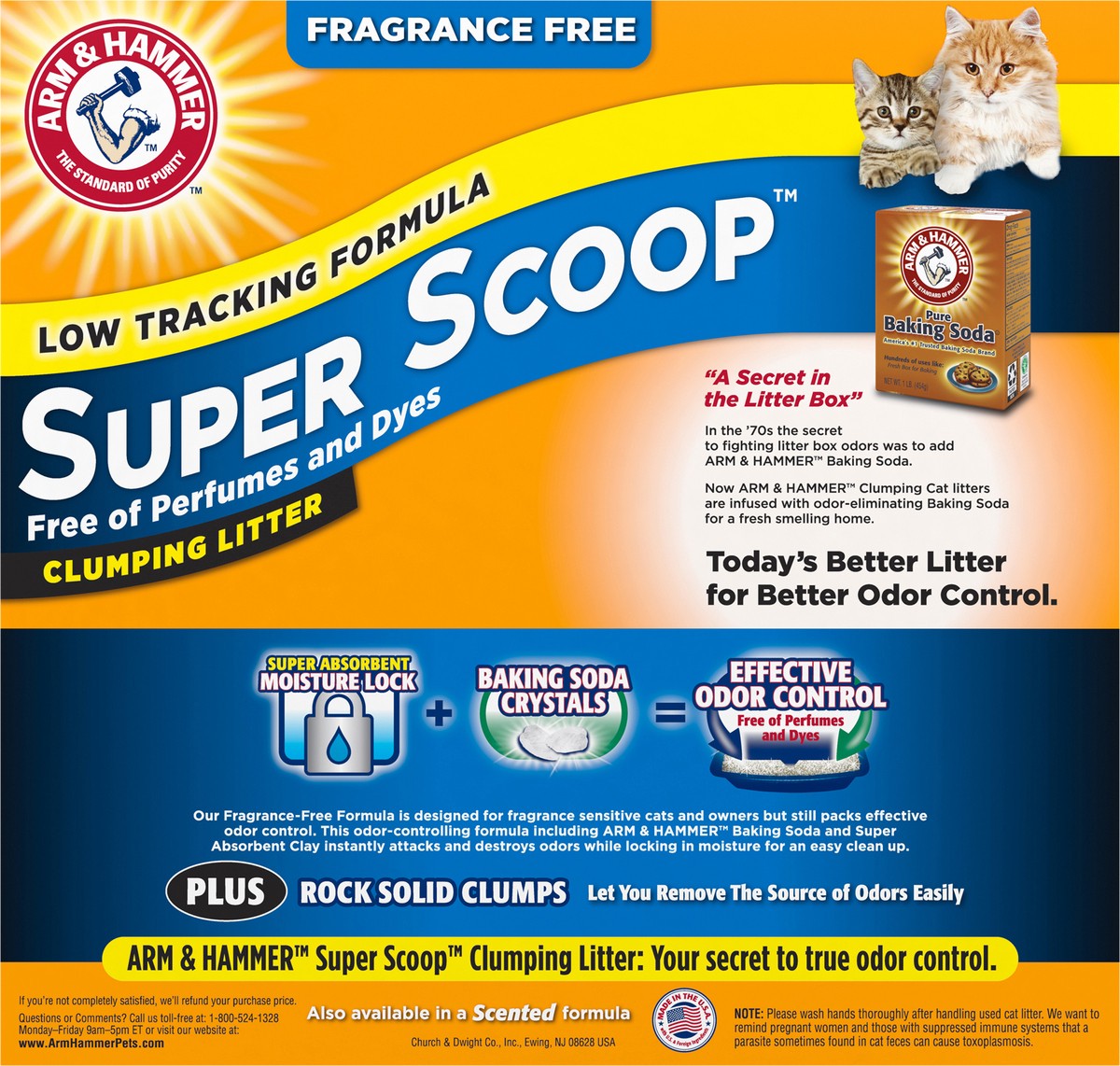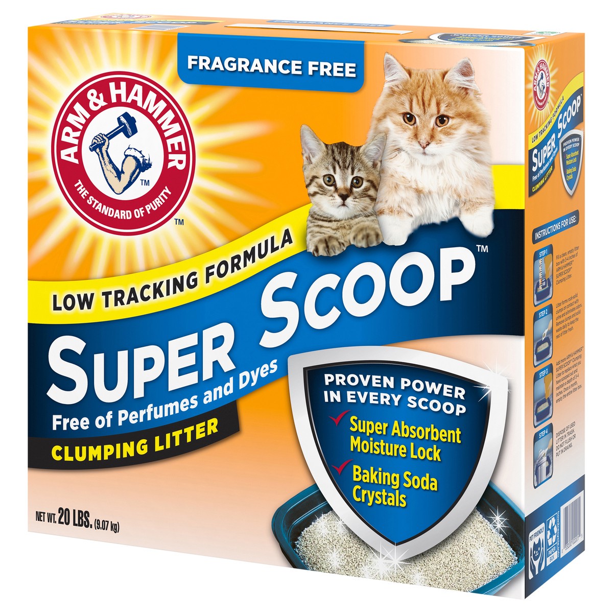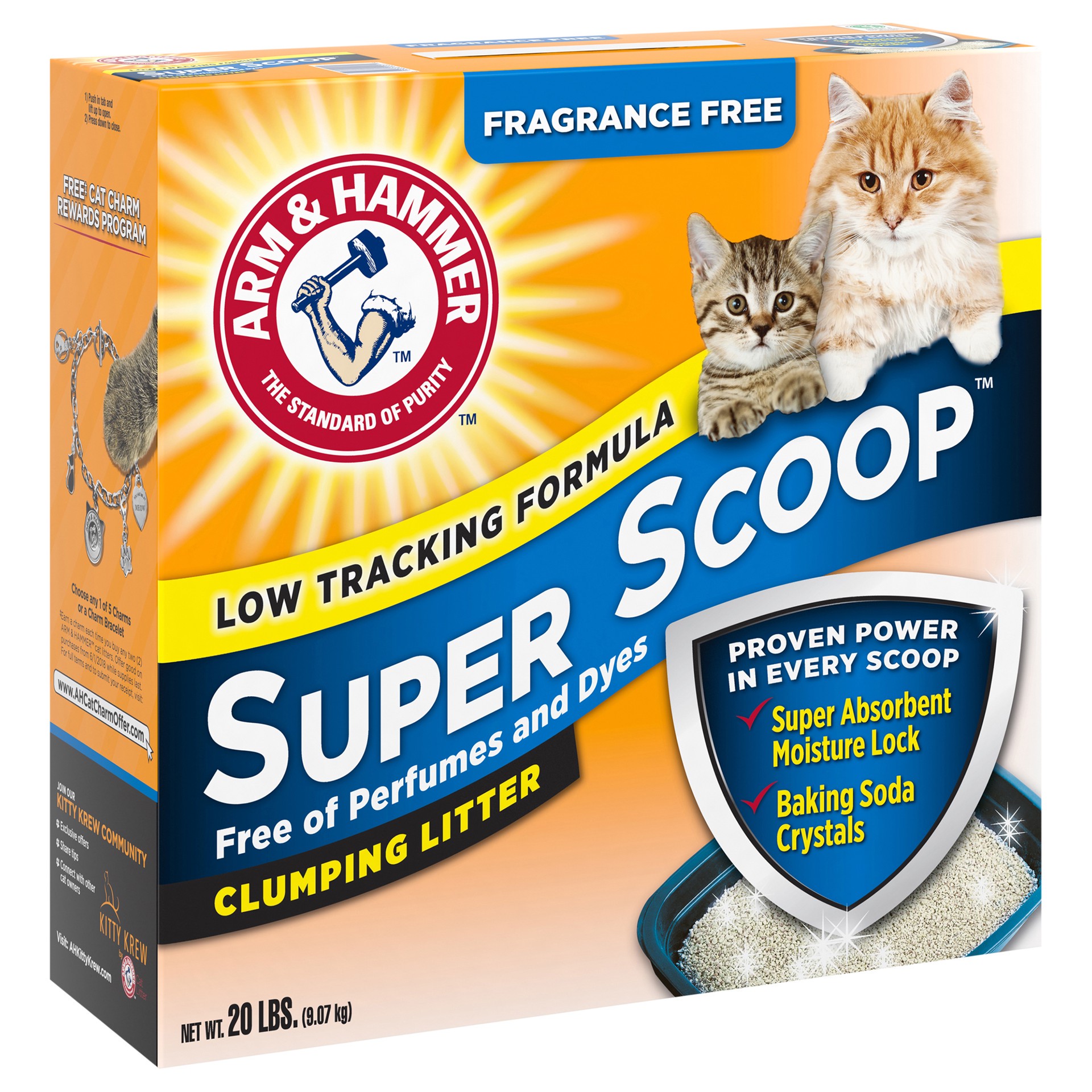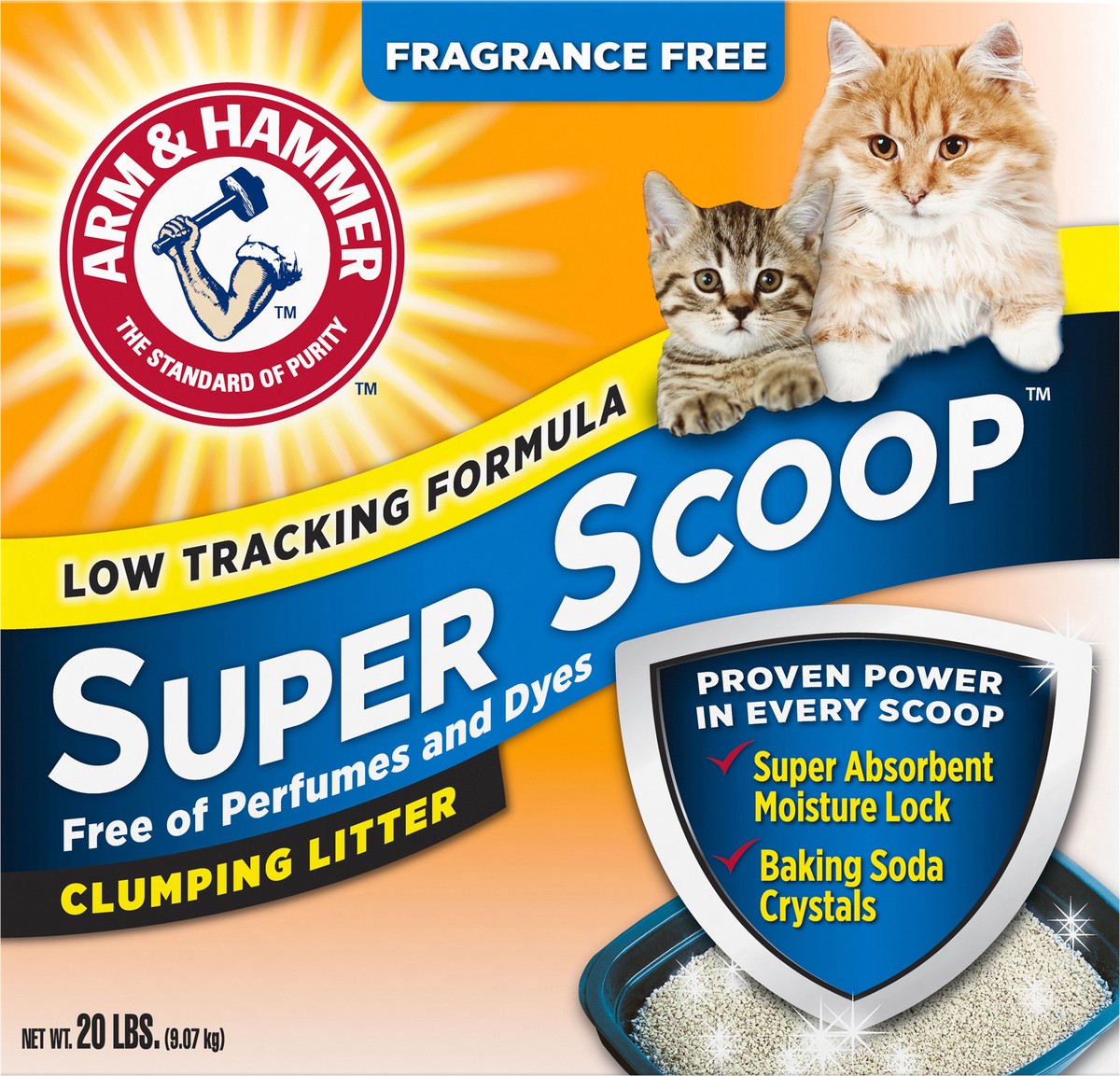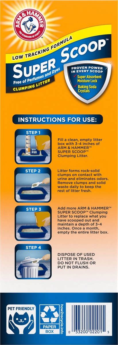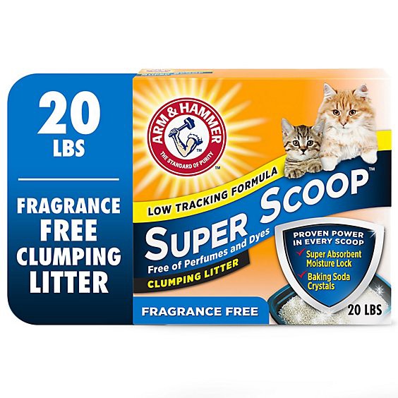 ARM & HAMMER Super Scoop Fragrance Free Clumping Cat Litter is a low tracking clumping litter with a super absorbent moisture lock clay formula with ARM & HAMMER Baking Soda to eliminate tough odors o…
