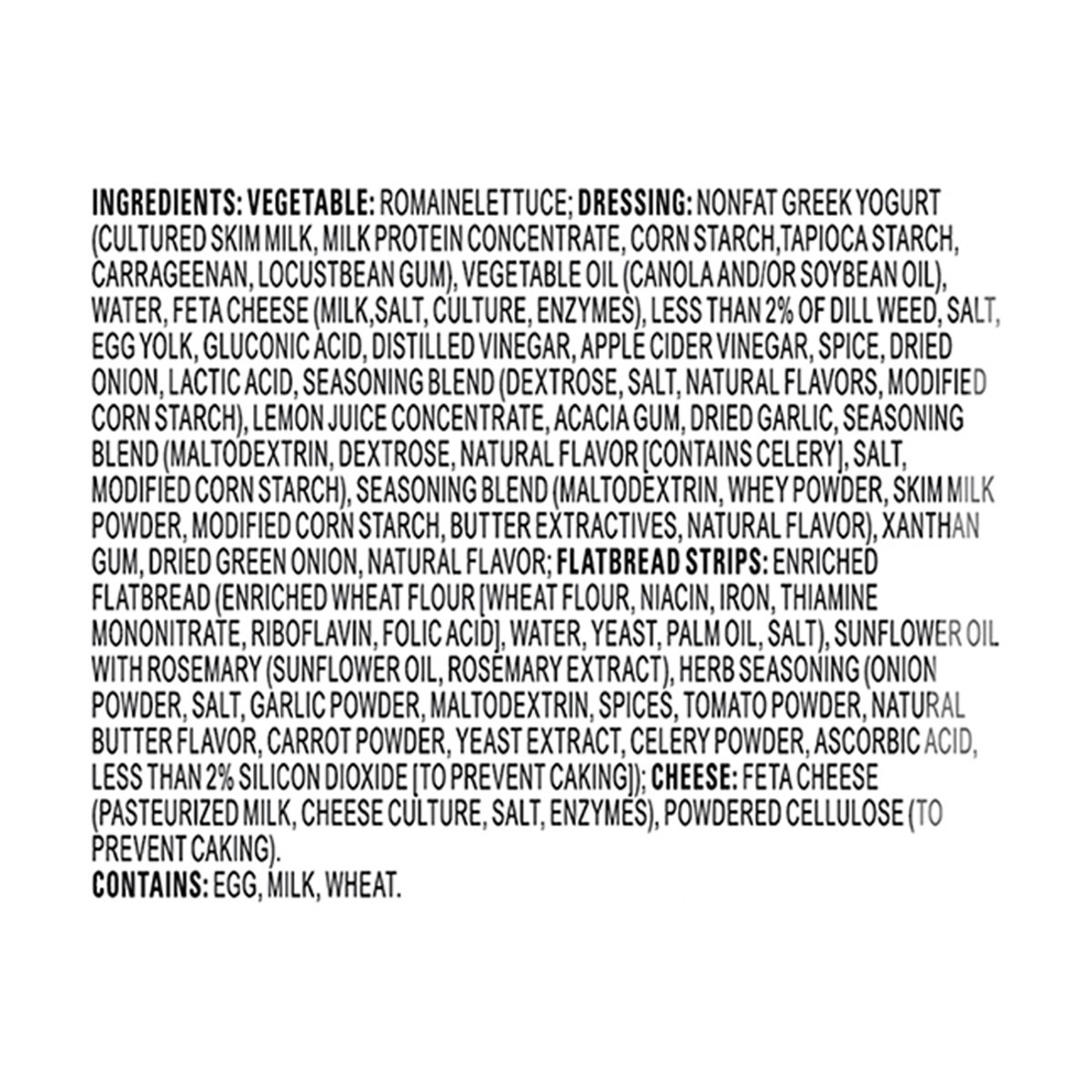 Vegetable: Romaine Lettuce; Dressing: Nonfat Greek Yogurt (Cultured Skim Milk, Milk Protein Concentrate, Corn Starch, Tapioca Starch, Carrageenan, Locust Bean Gum), Vegetable Oil (Canola and/or Soybea…