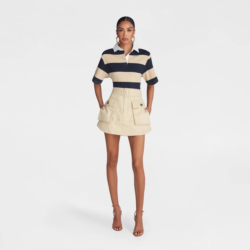 The coolest cargo, this flared mini skirt is made from a washed cotton twill fabric with just a touch of stretch and features a belted waist to accent your curves. Complete with large cargo pockets in…