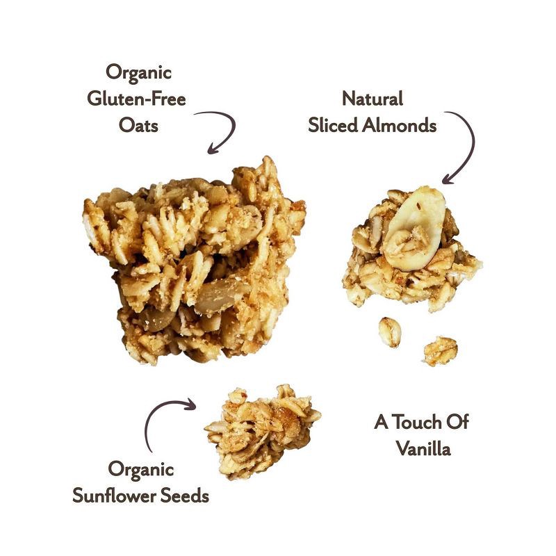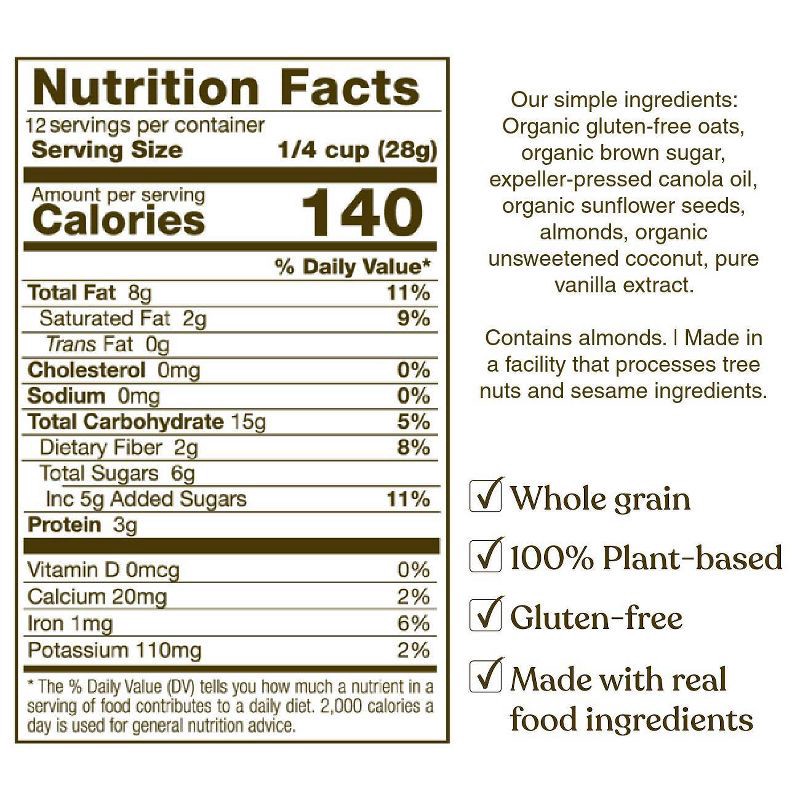 Our Simple Ingredients: Organic Gluten-Free Oats, Organic Brown Sugar, Expeller-Pressed Canola Oil, Organic Sunflower Seeds, Almonds, Organic Unsweetened Coconut, Pure Vanilla Extract.