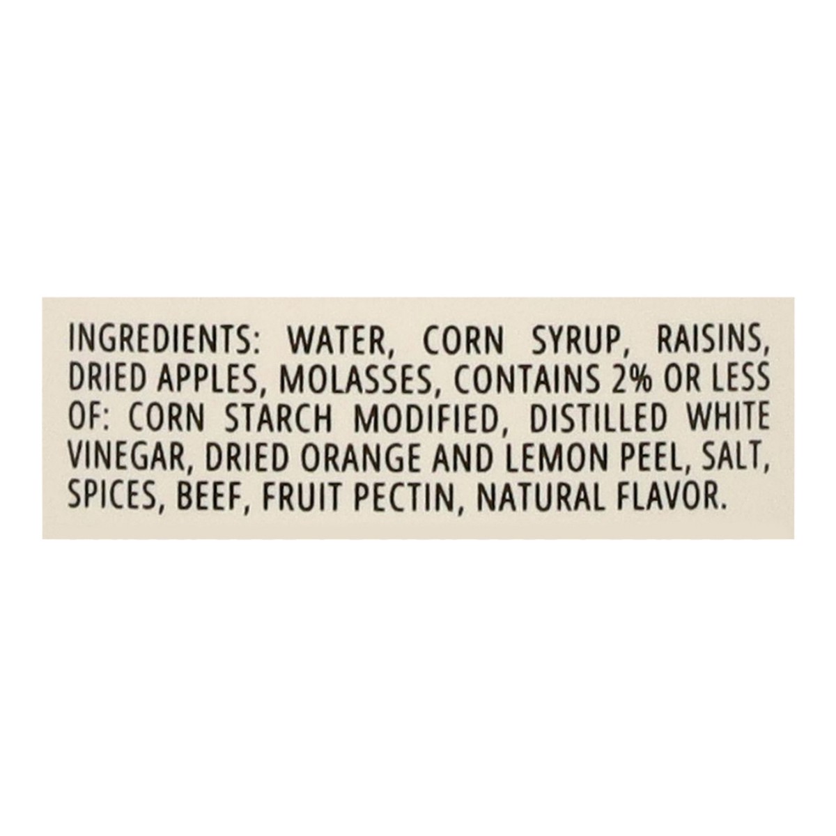 Water, Corn Syrup, Raisins, Dried Apples, Molasses, Contains 2% or Less of: Corn Starch Modified, Distilled White Vinegar, Dried Orange and Lemon Peel, Salt, Spices, Beef, Fruit Pectin, Natural Flavor…