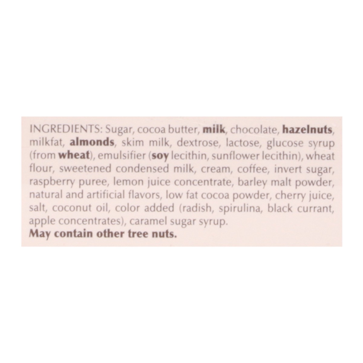 Sugar, cocoa butter, milk, chocolate, hazelnuts, milkfat, almonds, skim milk, dextrose, lactose, glucose syrup (from wheat), emulsifier (soy lecithin, sunflower lecithin), wheat flour, sweetened conde…