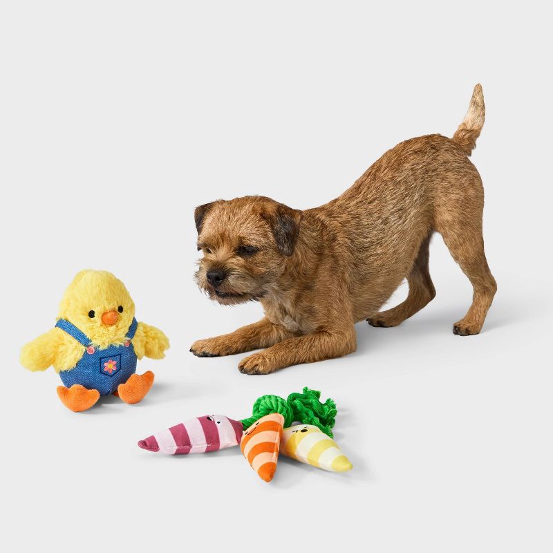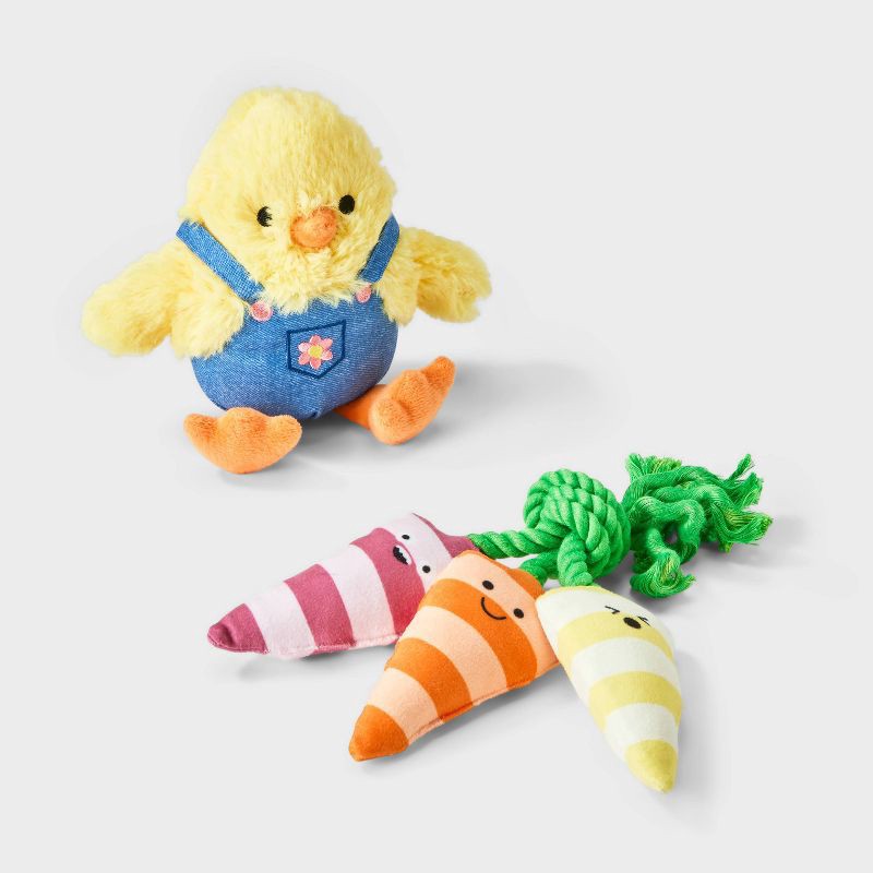 These 11.7-Inch Chick & Carrots Plush Rope Dog Toys from Boots & Barkley™ are the perfect Easter basket stuffers for your doggo. This two-pack set includes a yellow chick with orange feet and blue den…