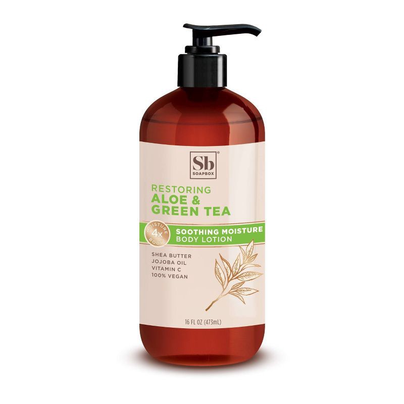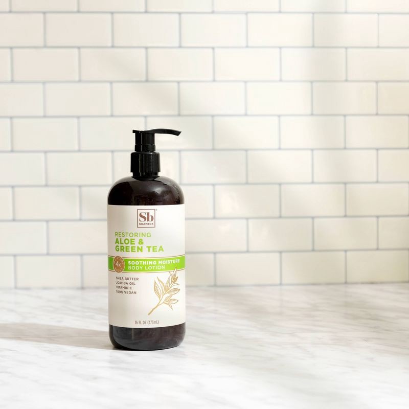 Order up! This lotion is serving soothed, smoothed and supple skin! Infused with skin calming aloe and green tea, restoring jojoba oil and brightening vitamin C, each pump delivers calming vibes and l…