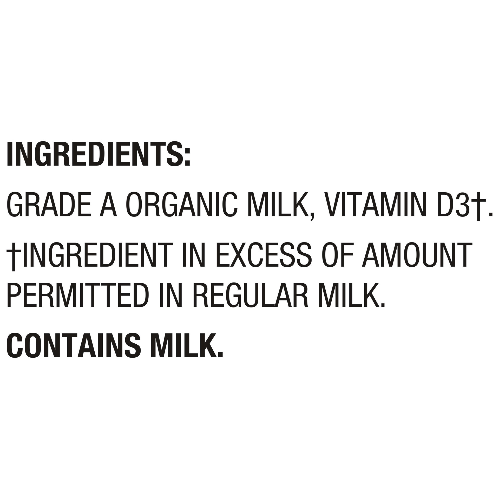 GRADE A ORGANIC MILK, VITAMIN D3†. †INGREDIENT IN EXCESS OF AMOUNT PERMITTED IN REGULAR MILK.