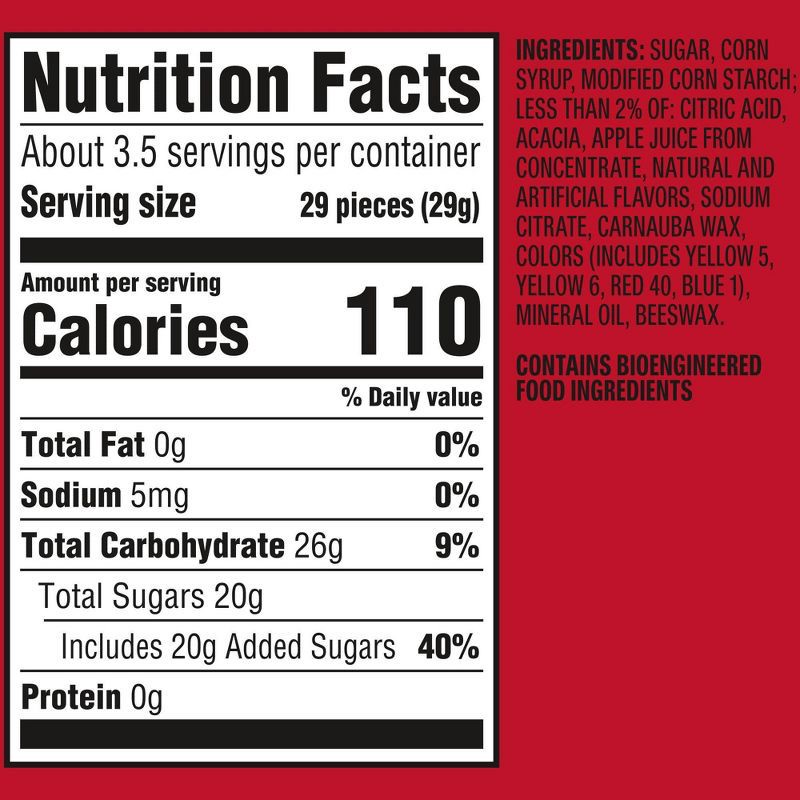 SUGAR, CORN SYRUP MODIFIED CORN STARCH; LESS THAN 2% OF: CITRIC ACID, ACACIA, APPLE JUICE FROM CONCENTRATE, NATURAL AND ARTIFICIAL FLAVORS, SODIUM CITRATE, CARNAUBA WAX, COLORS (INCLUDES YELLOW 5, YEL…