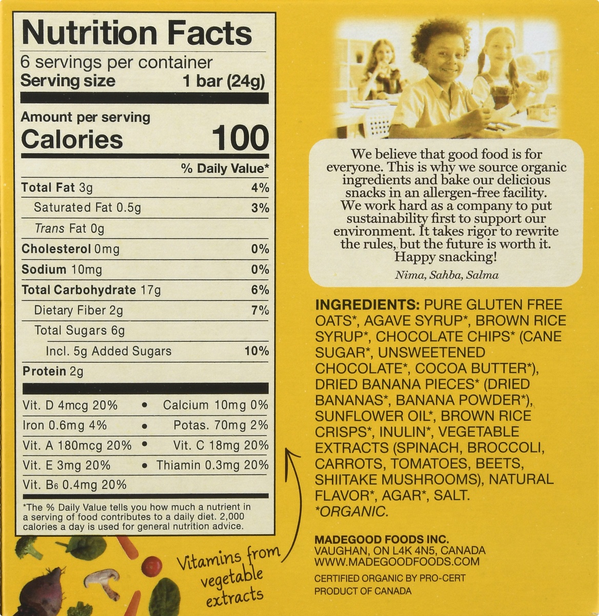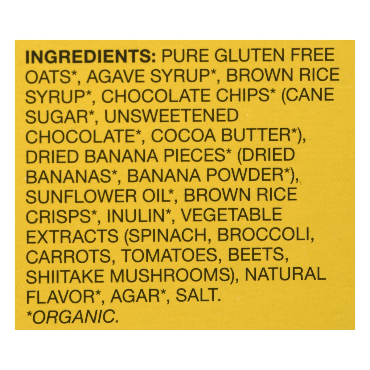 Pure Gluten Free Oats (Organic), Agave Syrup (Organic), Brown Rice Syrup (Organic), Chocolate Chips (Organic) (Cane Sugar (Organic), Unsweetened Chocolate (Organic), Cocoa Butter (Organic)), Dried Ban…