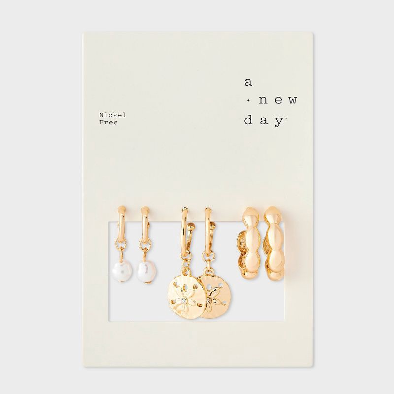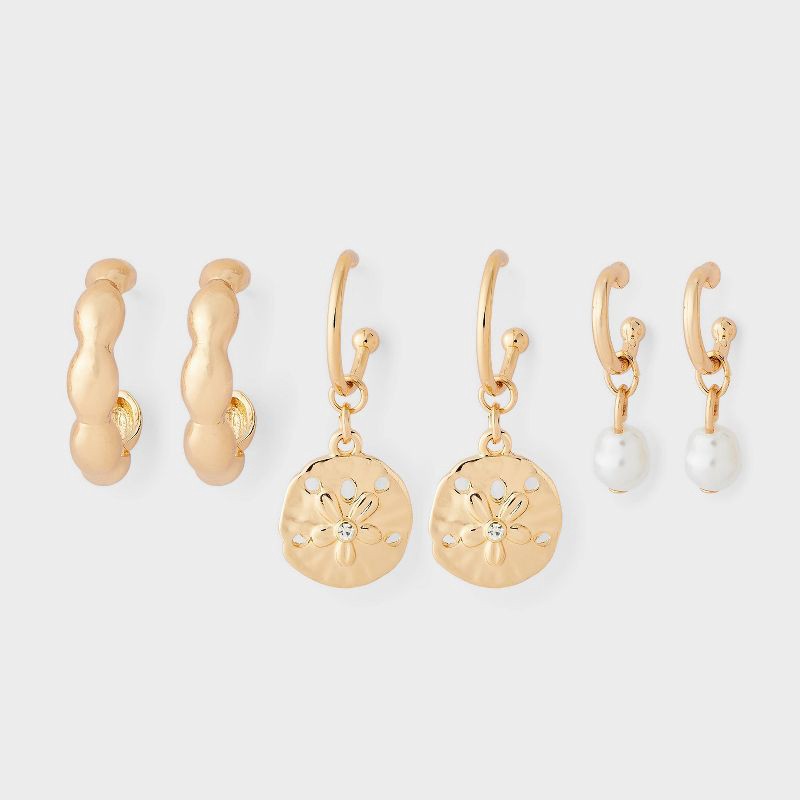 Lend the perfect finishing touch to any outfit with the 3-Pair Sand Dollar Charm Hoop Earring Set from A New Day™. This earring set includes one pair of twisted open hoops and two open hoops with flor…