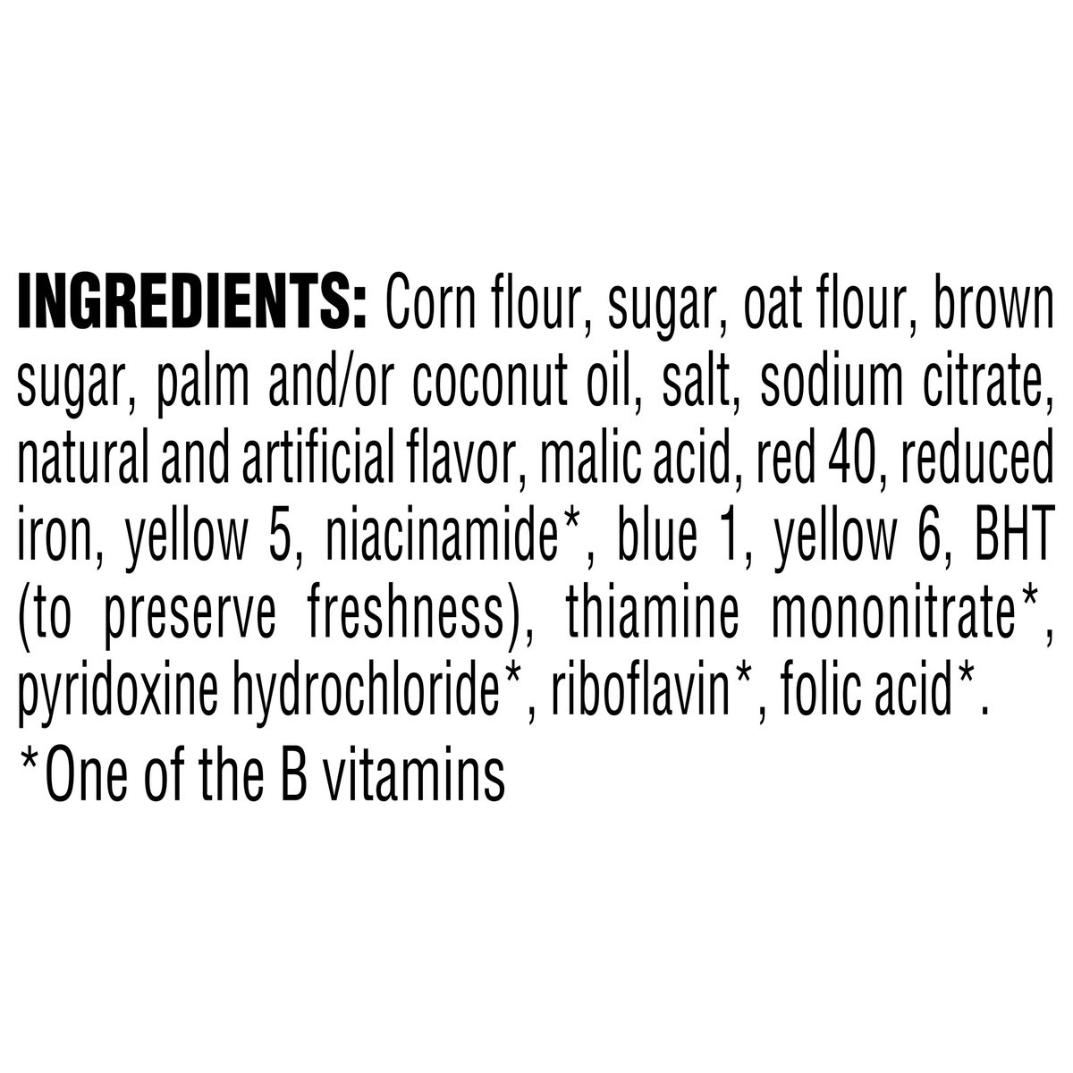 Corn Flour, Sugar, Oat Flour, Brown Sugar, Palm and/or Coconut Oil, Salt, Sodium Citrate, Natural and Artificial Flavor, Malic Acid, Red 40, Reduced Iron, Yellow 5, Niacinamide (One of the B Vitamins)…