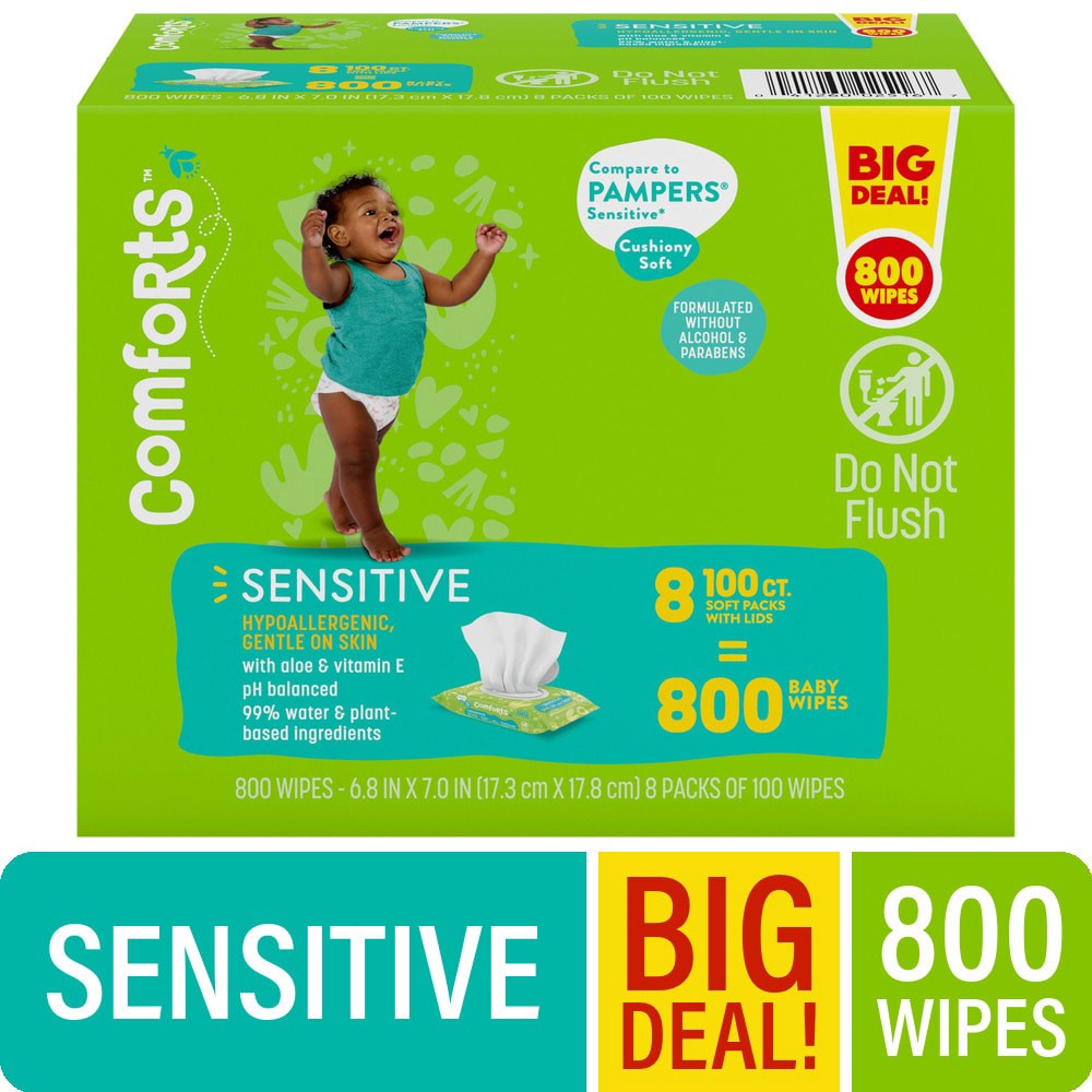 Comforts™ Sensitive Baby Wipes BIG DEAL! offer gentle cleansing for baby. These hypoallergenic wipes are made from quilted-thick, 99% water and plant-based ingredients for easy cleaning and care. Cont…