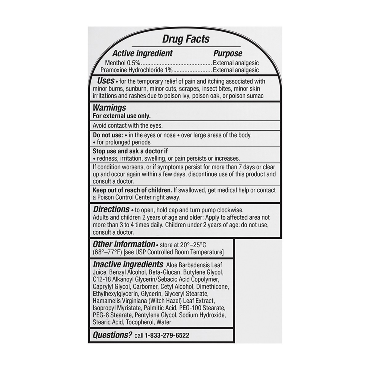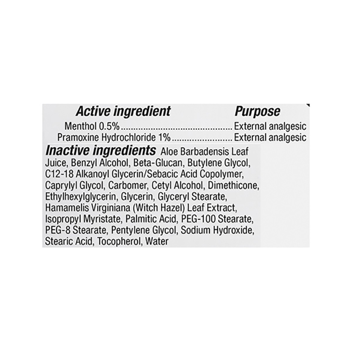 Active Ingredients: Menthol (0.5 %), External Analgesic; Pramoxine Hydrochloride (1 %), External Analgesic. Inactive Ingredients: Aloe Barbadensis Leaf Juice, Benzyl Alcohol, Beta Glucan, Butylene Gly…
