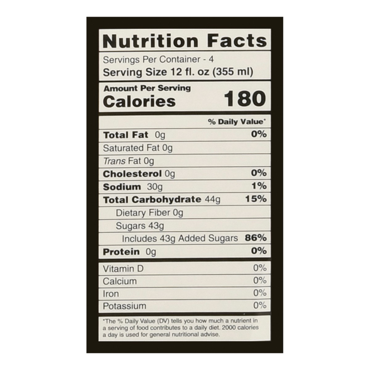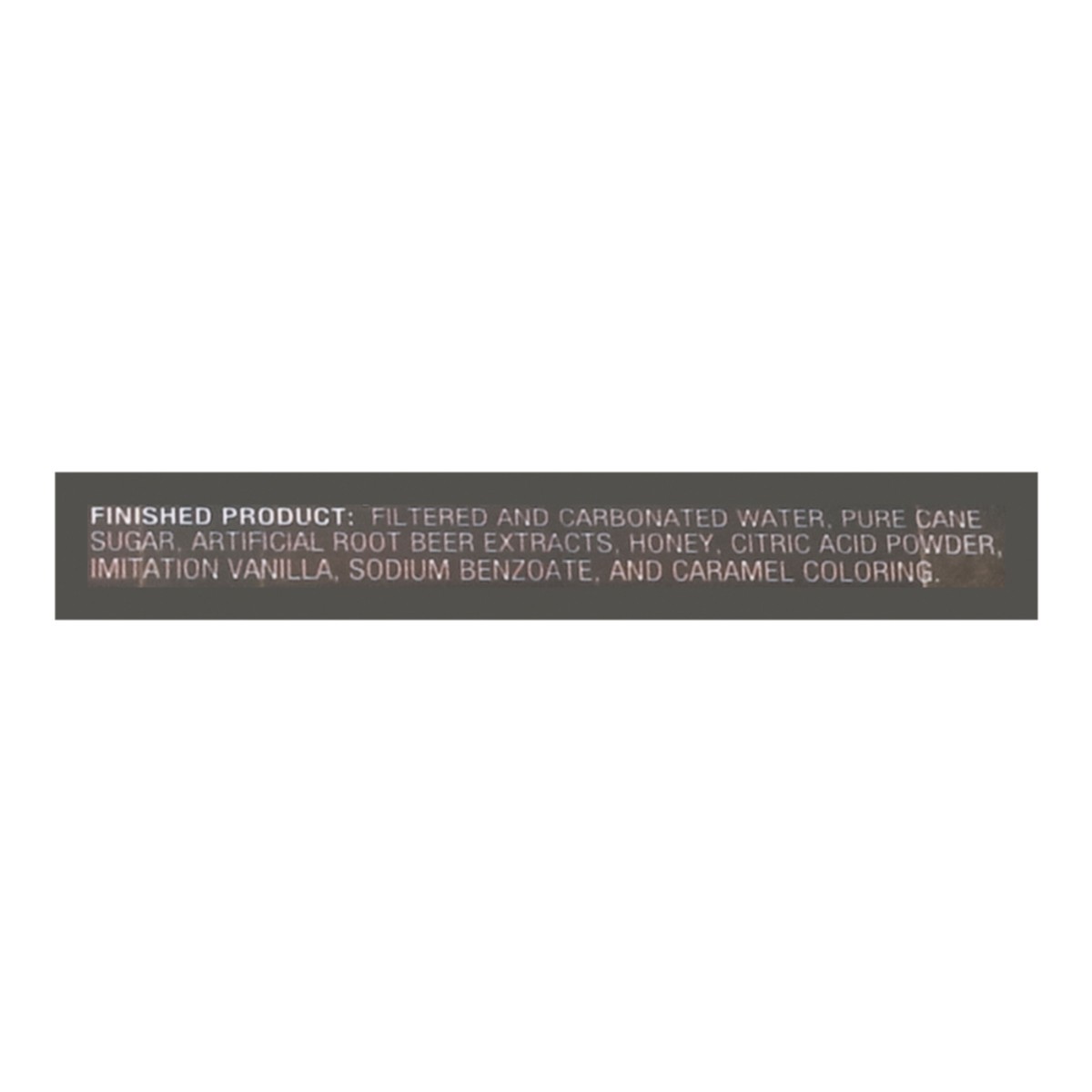 Filtered and Carbonated Water, Pure Cane Sugar, Artificial Root Beer Extracts, Honey, Citric Acid Powder, Imitation Vanilla, Sodium Benzoate, and Caramel Coloring.