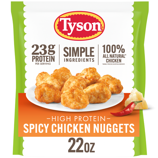 Looking for a delicious chicken nugget that's packed with protein and a spicy kick? Made with 100% all-natural* white meat chicken, Tyson High Protein Unbreaded Simple Ingredient Spicy Chicken Nuggets…