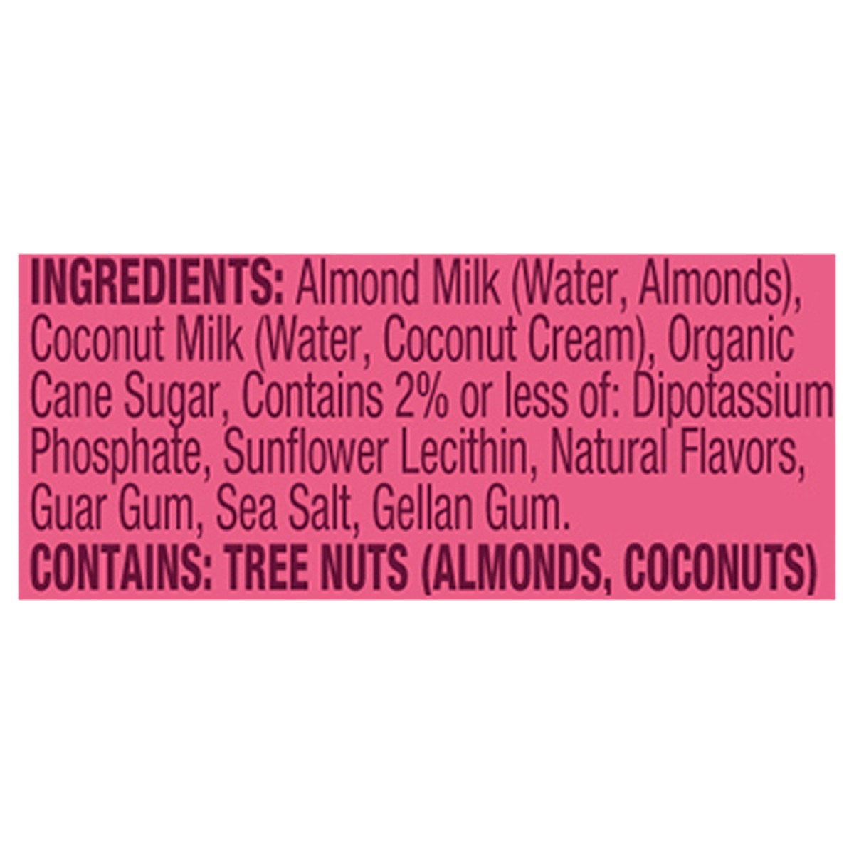 Almond Milk (Water, Almonds), Coconut Milk (Water, Coconut Cream), Organic Cane Sugar, Contains 2% or Less of: Dipotassium Phosphate, Sunflower Lecithin, Natural Flavors, Guar Gum, Sea Salt, Gellan Gu…